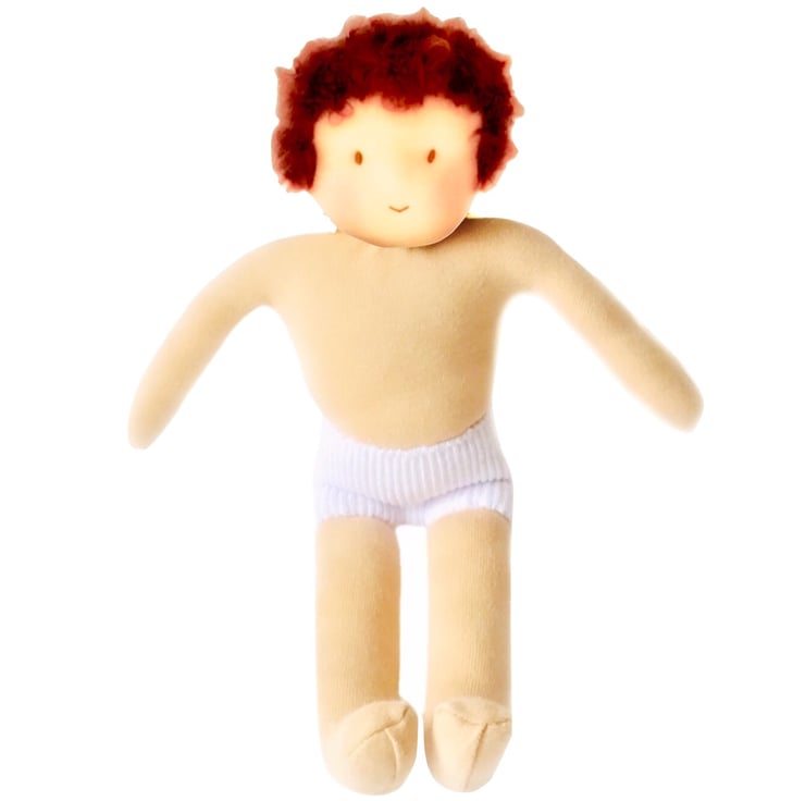 Billy is a little doll made from best quality CE safe de Witte doll skin from Holland. He is made using a technique very similar to the Waldorf method, is very soft and squeezable and sits down easily. His hair is made from pure wild mohair and his cheeks are coloured with beeswax. He is 28cm tall and is CE safe but is not suitable for children under 3.