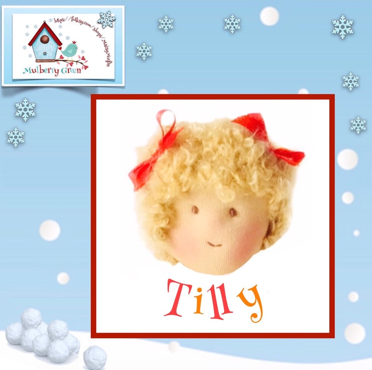 Tilly is a cute little doll made from best quality CE safe de Witte doll skin from Holland. She is made using a technique very similar to the Waldorf method, is very soft and squeezable and sits down easily. Her hair is made from pure wild mohair and her cheeks are coloured with beeswax. She is 28cm tall and is CE safe but is not suitable for children under 3.