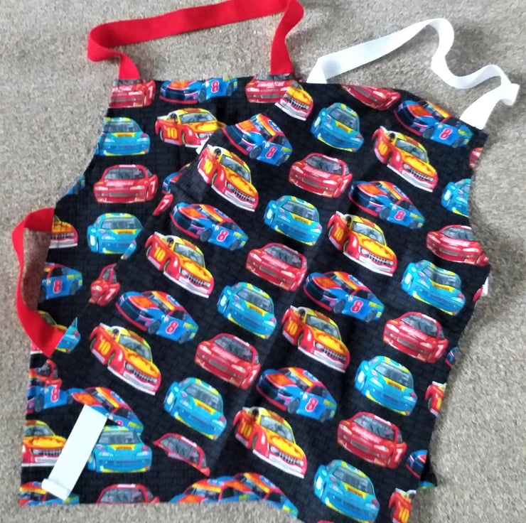 I originally made pinnies for my own children, now in their forties. I cannot resist attractive cotton fabrics for kids! Over the years I have made and sold hundreds of these little aprons. I bought this piece of fabric in order to make something for my car crazy grandson, and thought there must be other car crazy children out there!