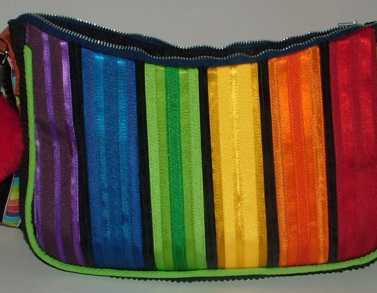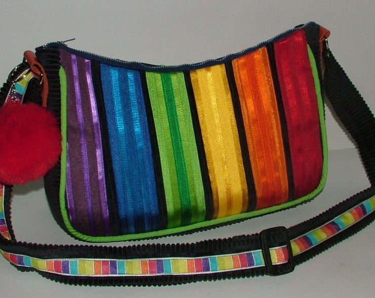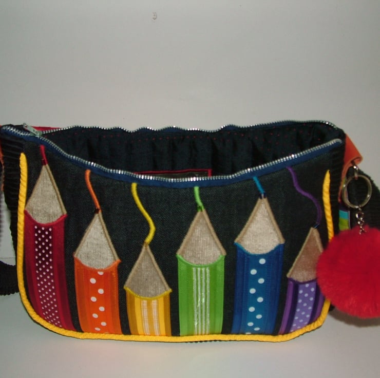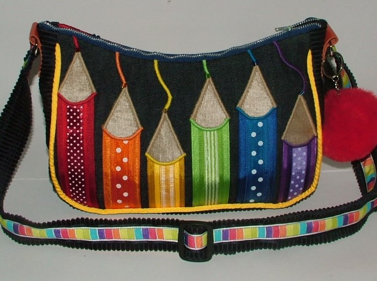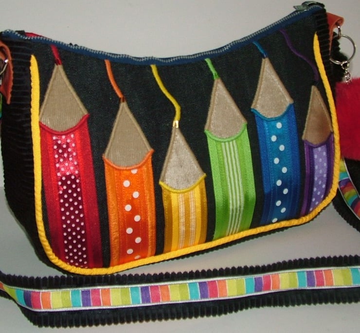 This unique handbag utilizes the fantastic qualities found in satin ribbon and has been handcrafted to produce a fun and colourful handbag that features rainbow pencils