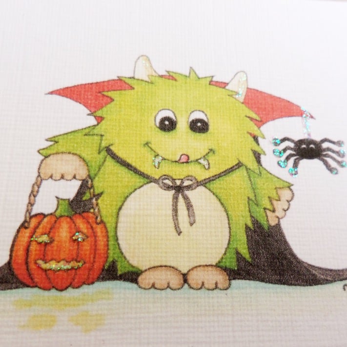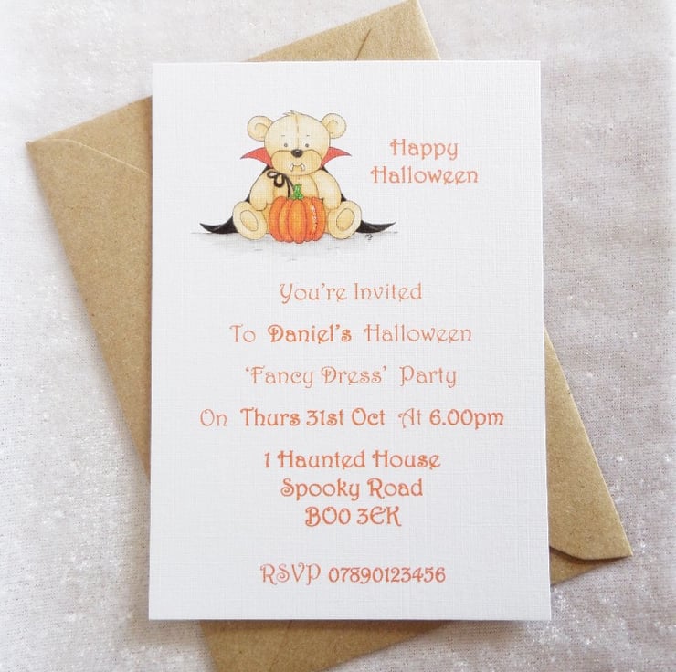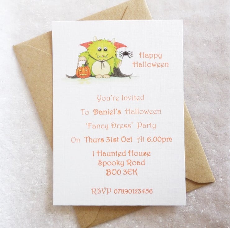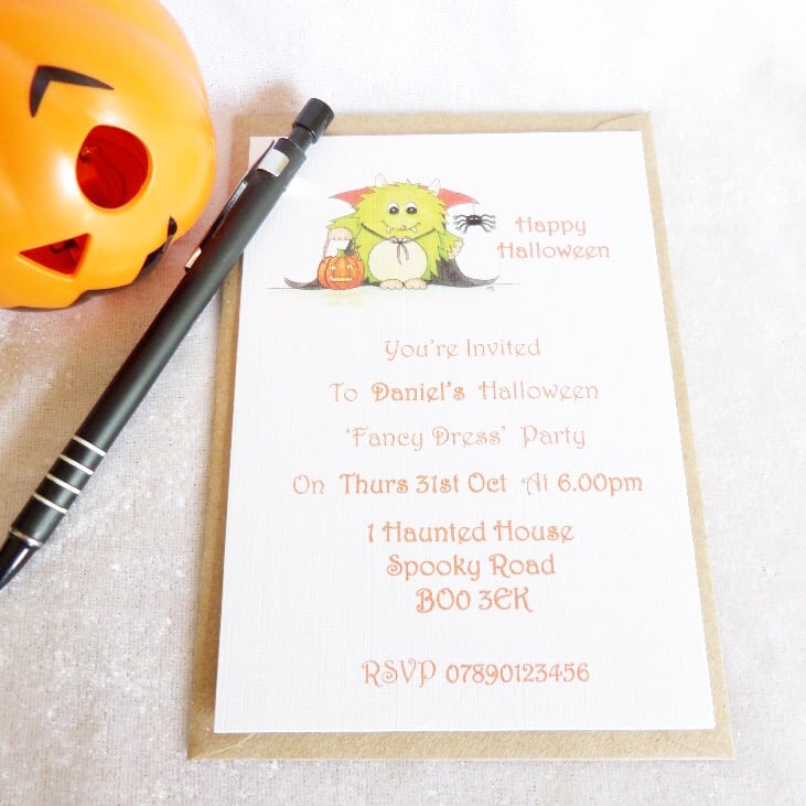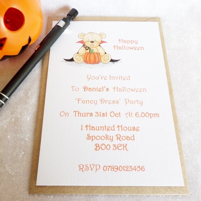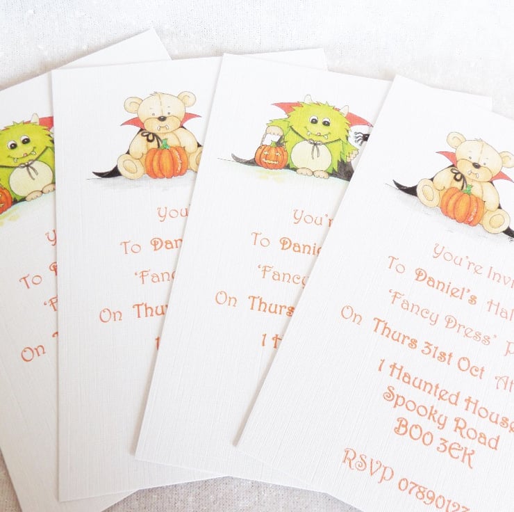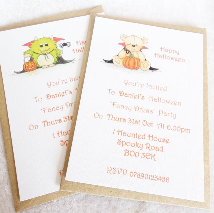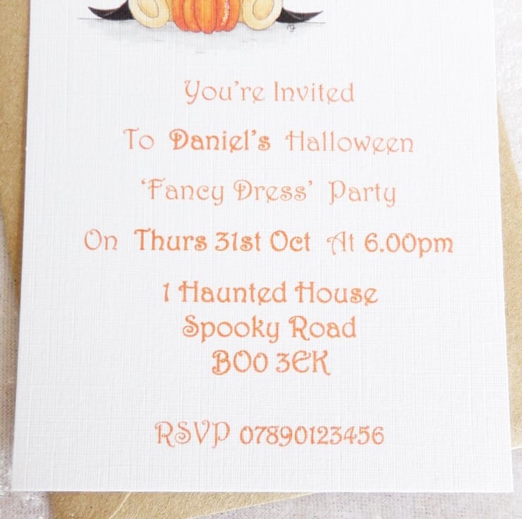 These cute Halloween invitations have been designed using my own original artwork. The image and text have been printed out onto good quality white linen embossed card. I have also added a little glitter detail to each design.