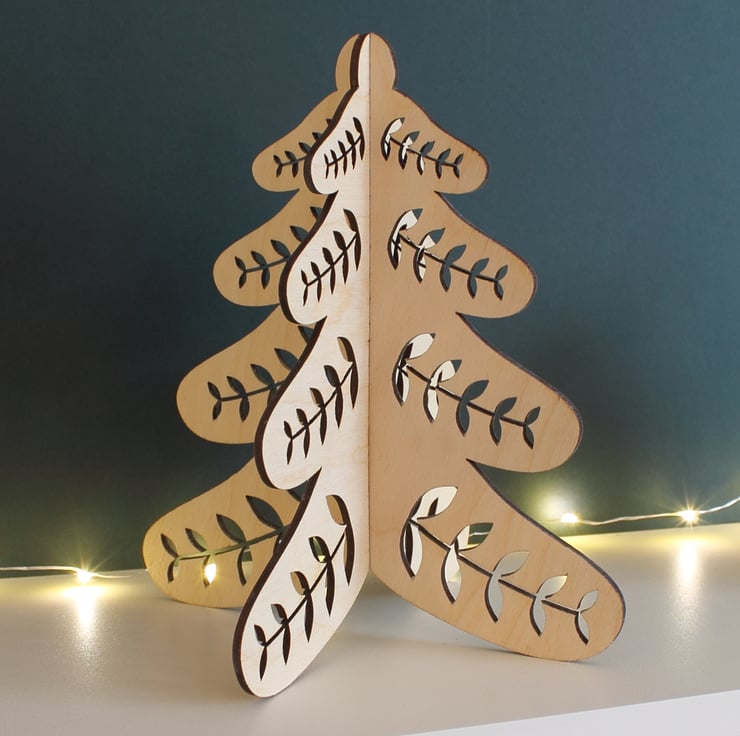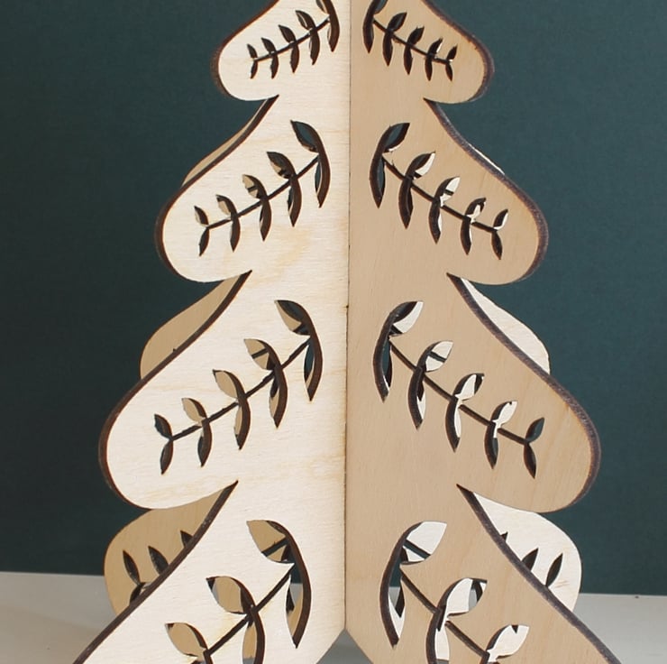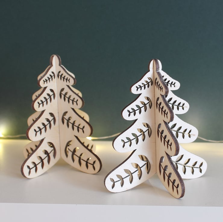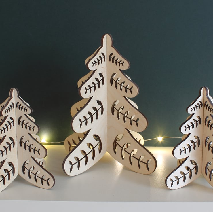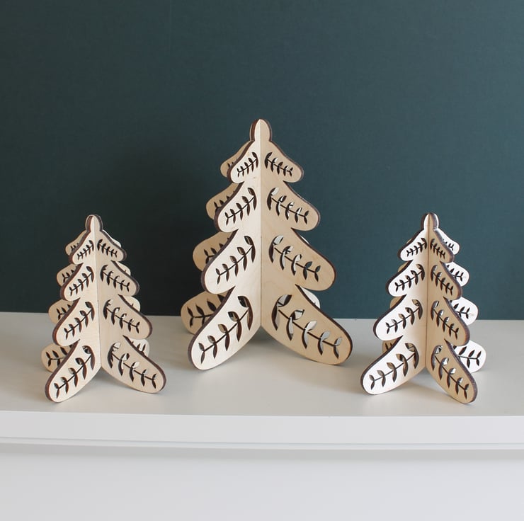 Set of 3 slot together plywood Christmas trees, with cut out leaf stem detail.