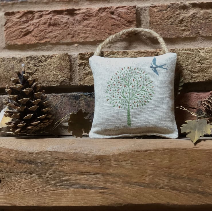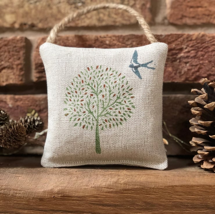A hanging Lavender Sachet constructed from a beautiful linen fabric which I have block stamped with a swallow and tree design. The little autumnal leaves have been hand painted on to the design.Generously filled with fragrant Cotswold Lavender .A lovely item perfect to fragrance wardrobes,drawers, boot/ utility rooms or alternatively just hang as a decorative item in your home