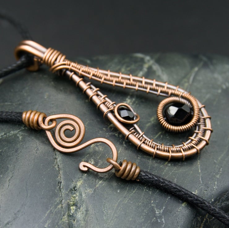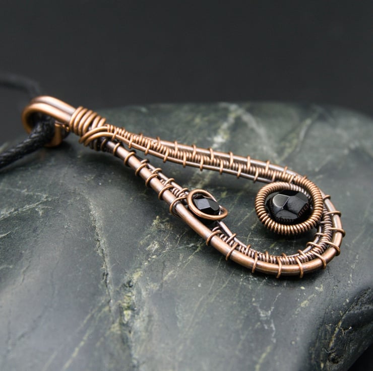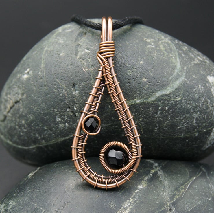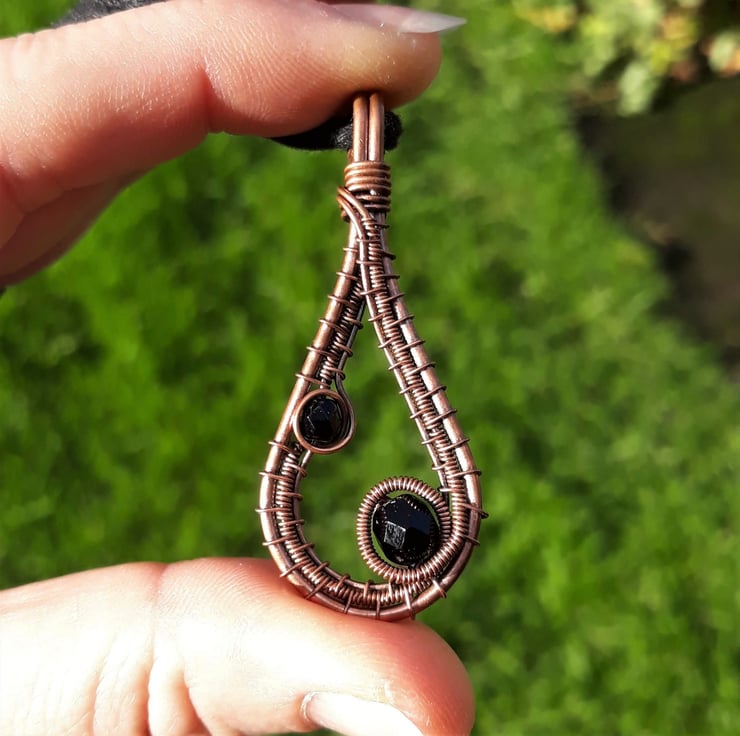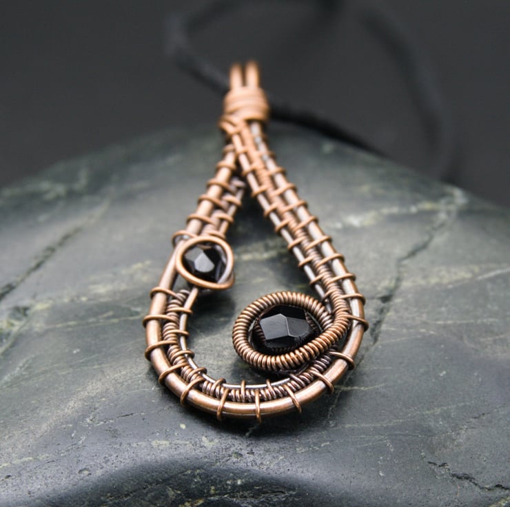 This pretty pendant is made from copper wire. I've formed a drop shape from thicker wire, & have woven finer wires within, adding two glass beads along the way. The beads are faceted black glass which compliments the copper colour perfectly, making this a simple, classic design which would go with any outfit!