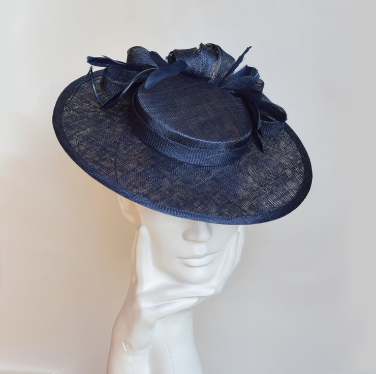 Rebecca is a glamourous brimmed hat with petite (5 inch) crown, designed to perch towards the front of the head. This perching boater style hat has been trimmed with sinamay swirls, a spray of coq feathers and finished with a subtle curled quill for a very feminine silhouette. Shown here in navy blue, it can be tailored to your outfit on request.