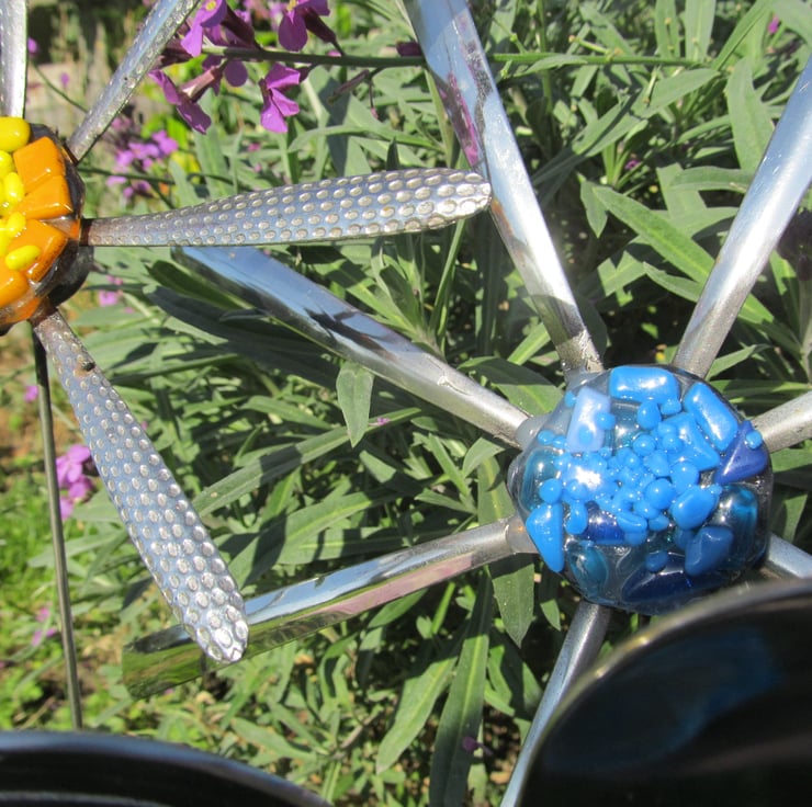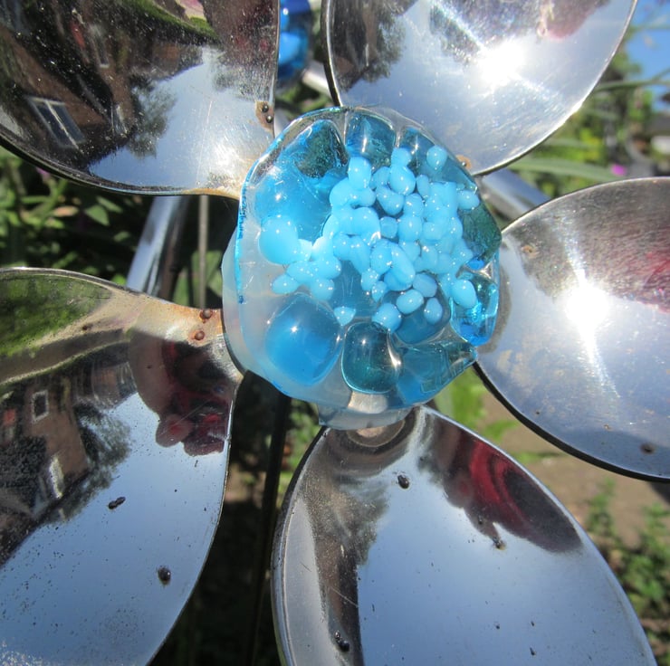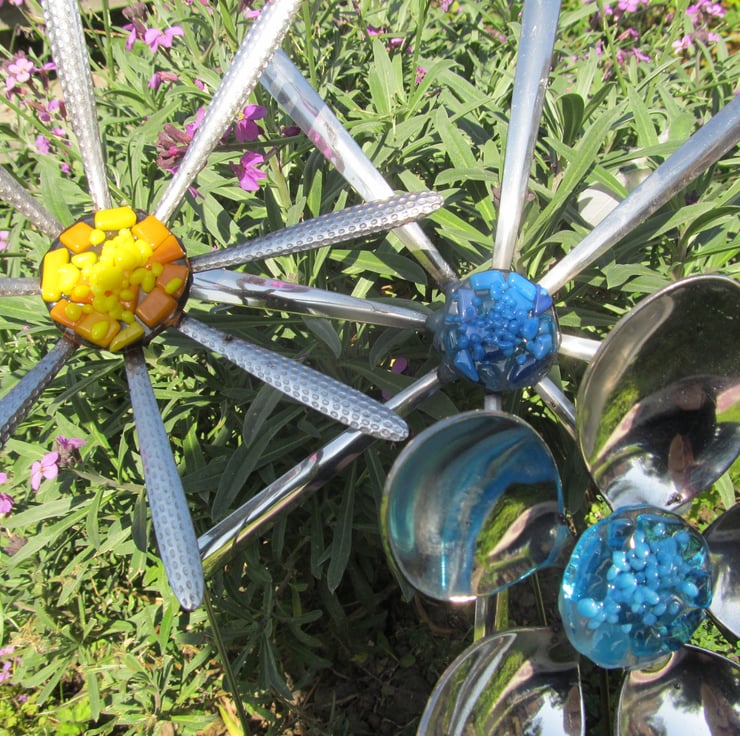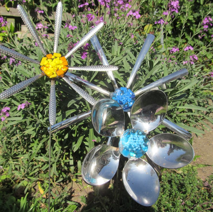 Place them in an existing flower bed among natural blooms or stake them into large pots to compliment the plants. Each flower has been hand made and given a fused glass centre. This set consists of 2 spoon handle daisies (one with a blue glass centre and one with yellow) and a spoon daisy with a blue glass centre.