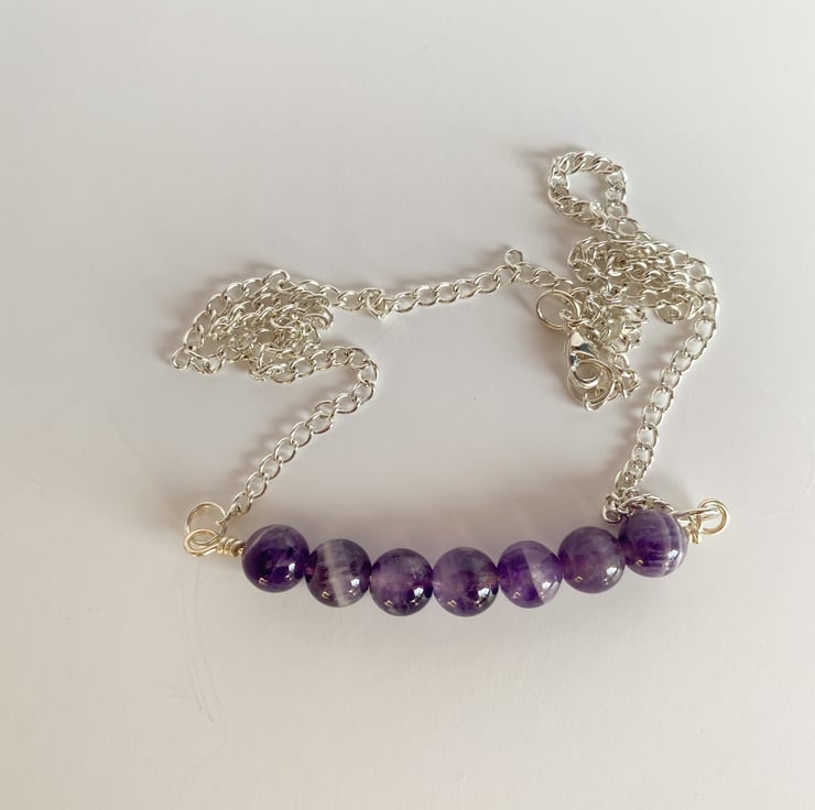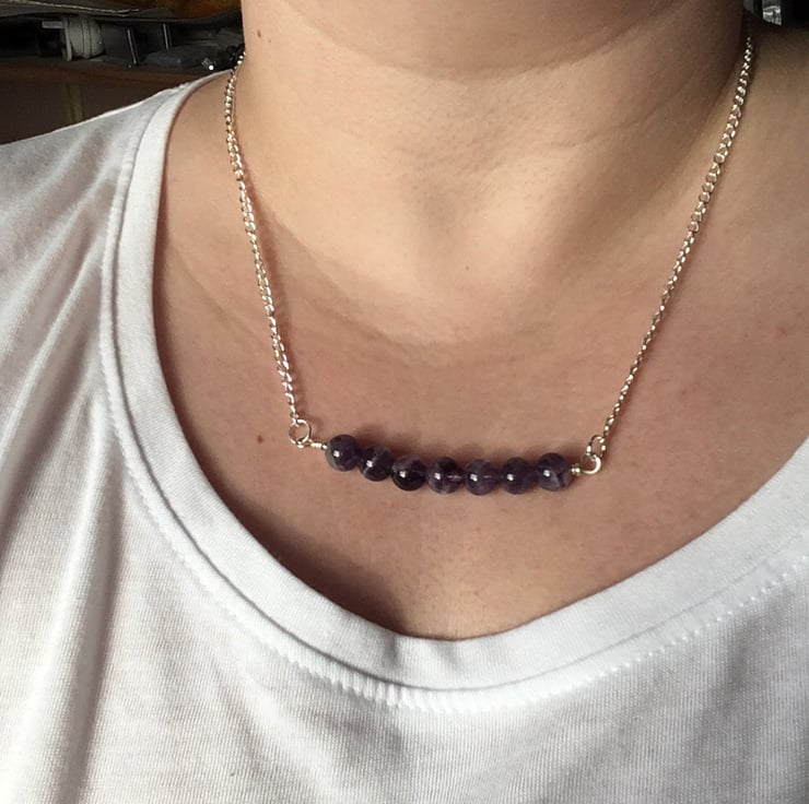 This is a beautiful bar necklace, created with 7 dainty ameythst beads and a silver plated chain.