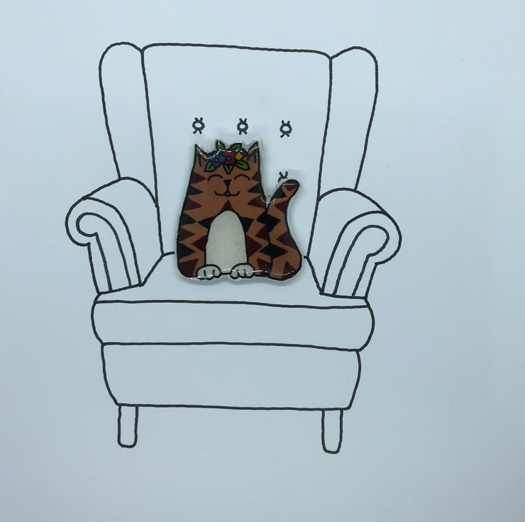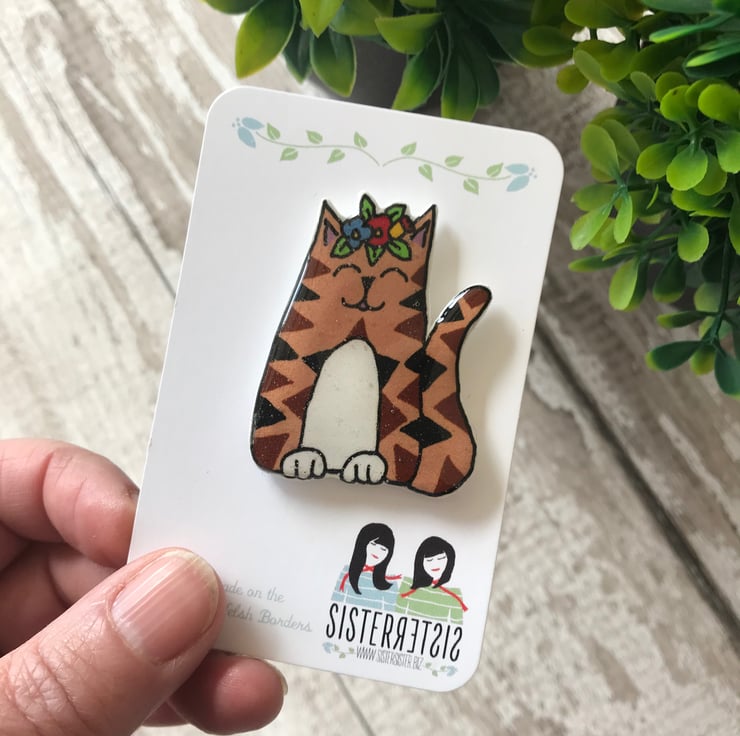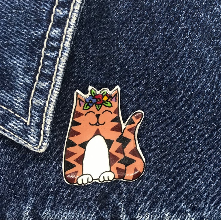 The puuurrrrfect gift for any cat lover. My little cat pins are taken from my original hand drawings. This little Brown Tabby Cat is wearing a crown of flowers and will sit pretty on any coat or bag