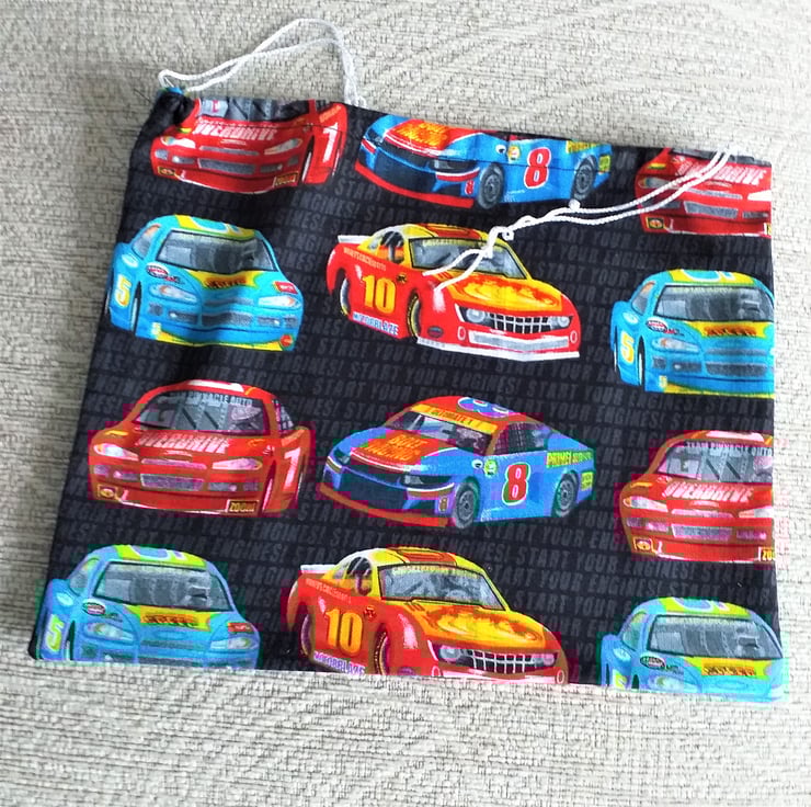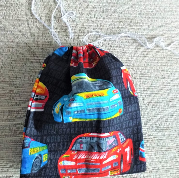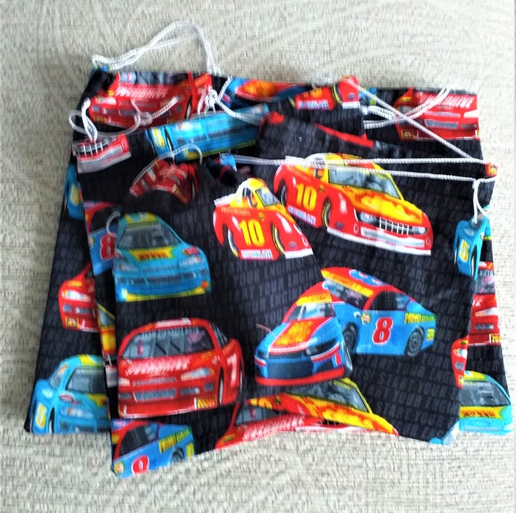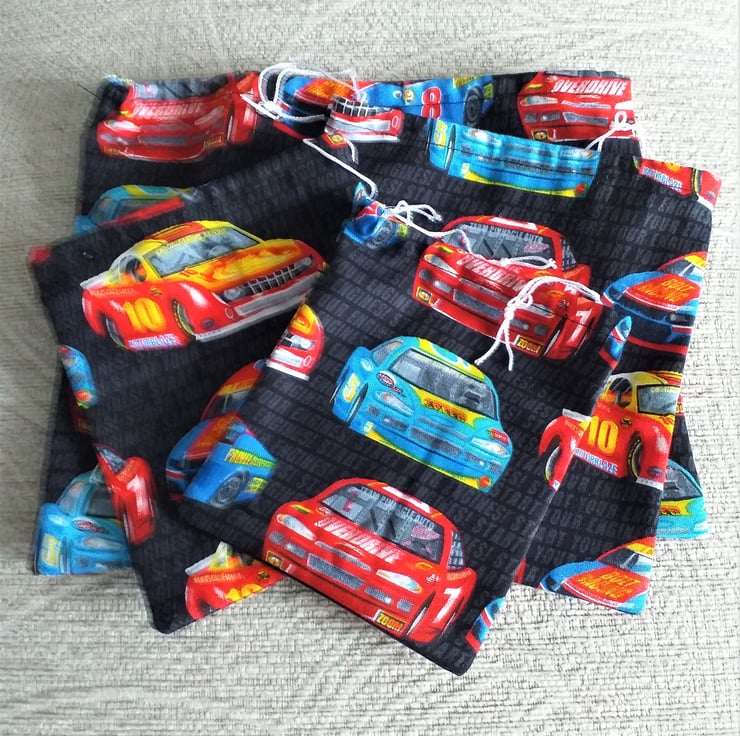 This is a fun set of four black drawstring bags with red and blue rally cars lined up on them to make special gifts even more special. The words 'Start your engines' appear in charcoal grey against the background.The largest bag measures 8.5".(22cm.) x 7" (18cm.) approximately. They are cotton, washable and reusable.