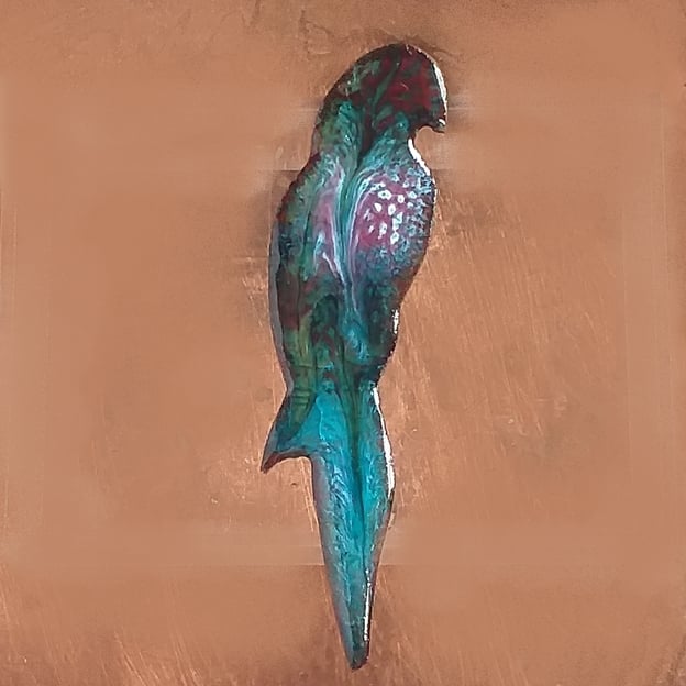 This parrot is decorated with a layer of turquoise enamel over several layers of clear enamel. Over this, I have scattered red and white enamel, scrolled to add plumage to the bird.