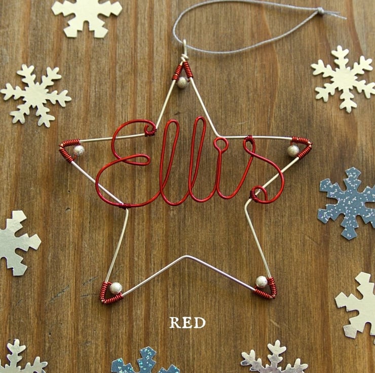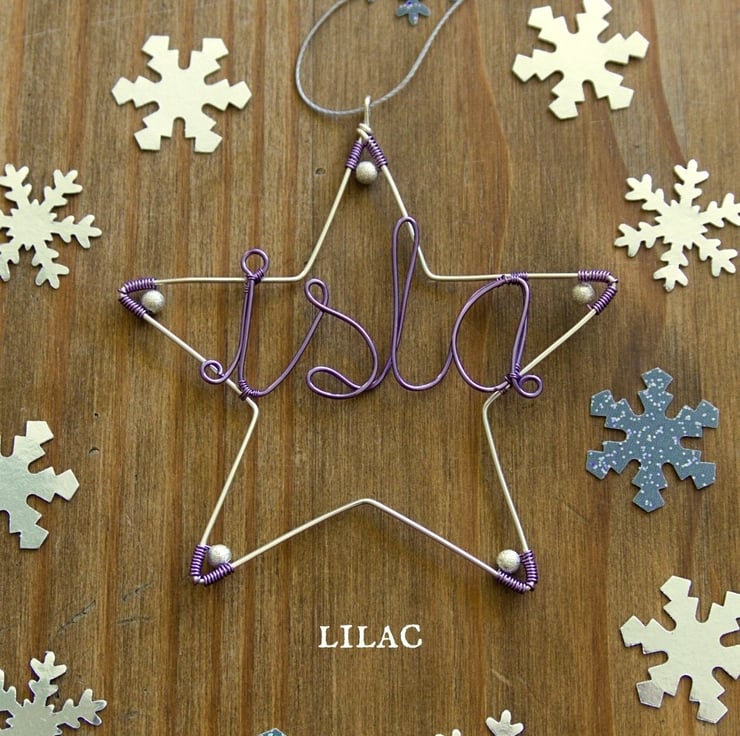 These special personalised Christmas decorations are handmade to order in a choice of colours and would make a fab stocking filler or secret Santa gift. They are also perfect for a first Christmas present for a new baby! Each decoration is completely handmade - I start by forming the silver star frame, before wrapping each point with your choice of coloured wire and little silver sparkle beads. I write the name using soft coloured wire before wrapping it onto the frame and finally adding a silver string hanging loop. These beautiful personalised stars make a special present to be treasured for years to come.