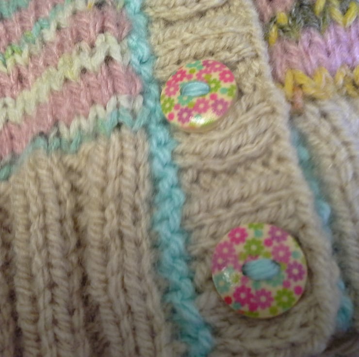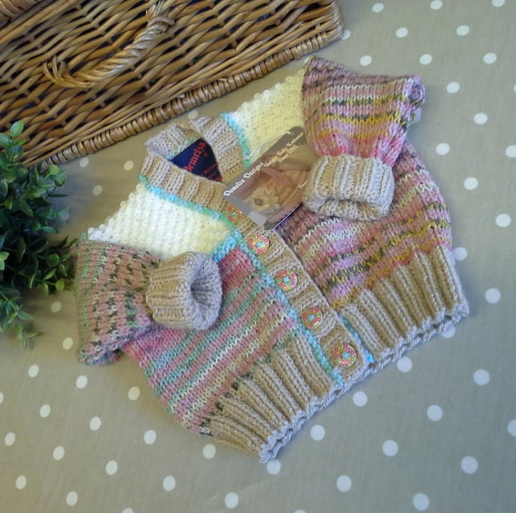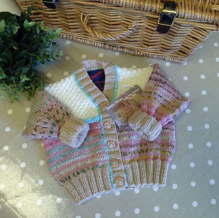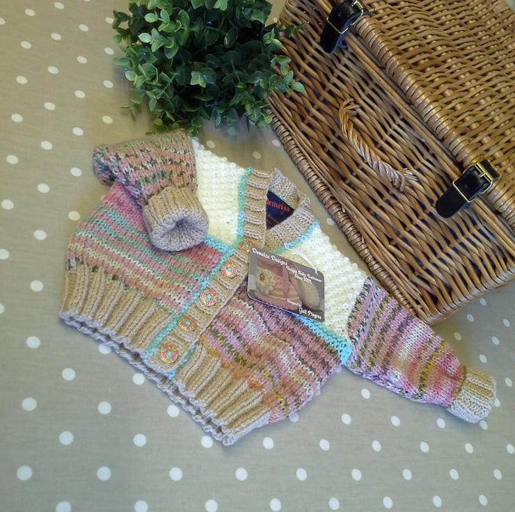 A very practical eye catching baby girl's cardigan designed and totally hand crafted using quality branded British and French machine washable yarns. The buttons are made from genuine wood with a sweet floral design on them. The item has the branded designer garment tag attached to the back neck edge with the care instructions woven within it for lasting reference.