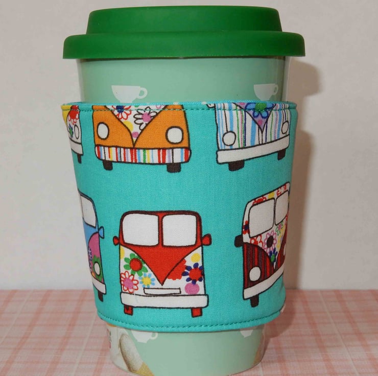 This cosy is designed to fit travel mugs similar to the one in the photo (mug not included). It is approximately 3.25 inches deep and fastens with Velcro. It is reversible with the Camper van print on one side and a toning spot print on the other side, and a layer of cosy wadding.