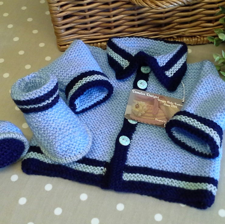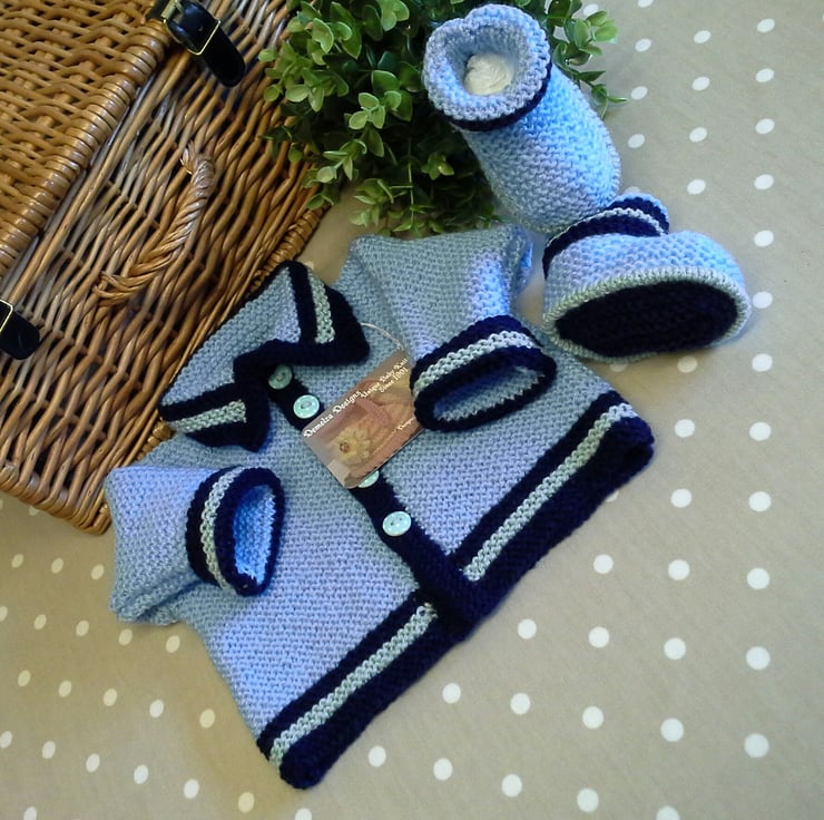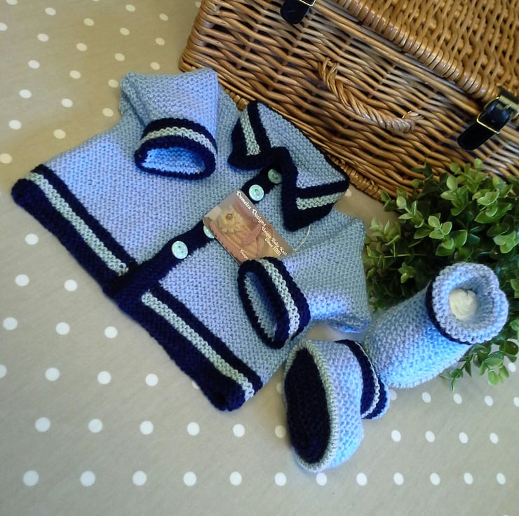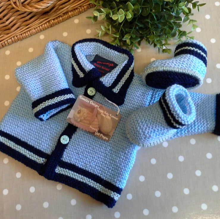 This set will make a perfect gift for any new baby boy for mothers/careers whom value and appreciate quality individual hand made baby British products as apposed to mass produced goods churned out by the thousands. The jacket has the branded Demelza garmen label attached to the back neck edge with the care instructions woven within it for lasting reference and a garment swing tag attached.