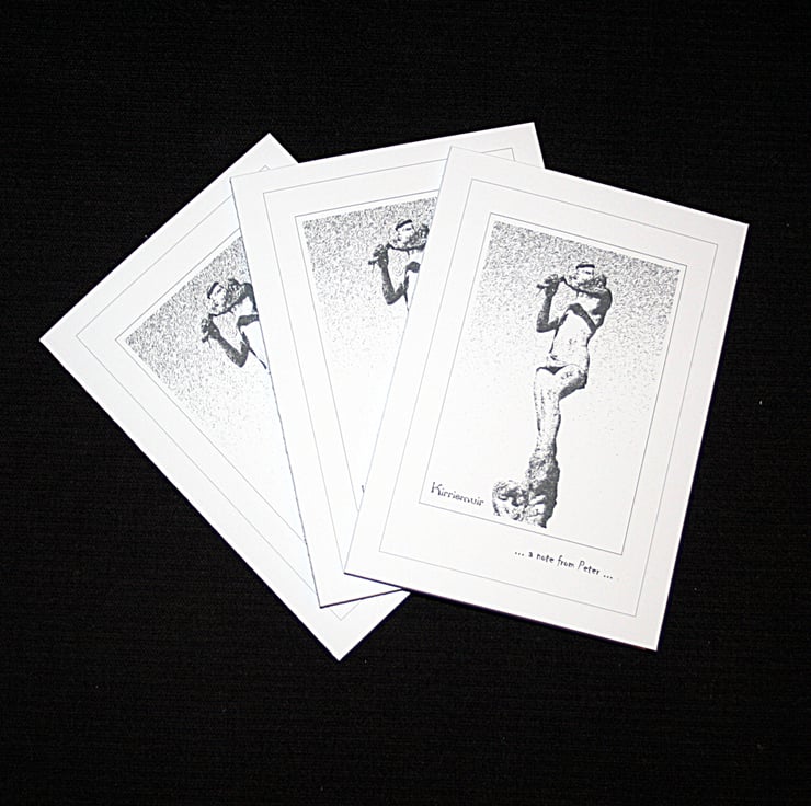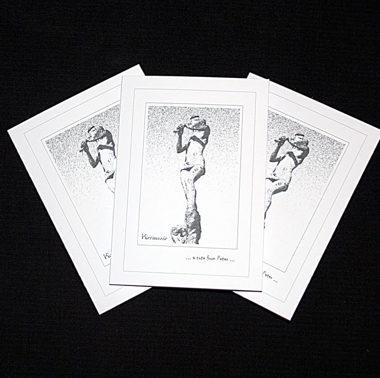 A digitally enhanced image of the statue in Kirriemuir is printed on white 300gsm card. The cards are blank inside.