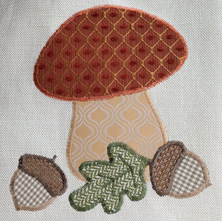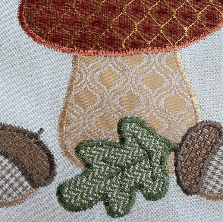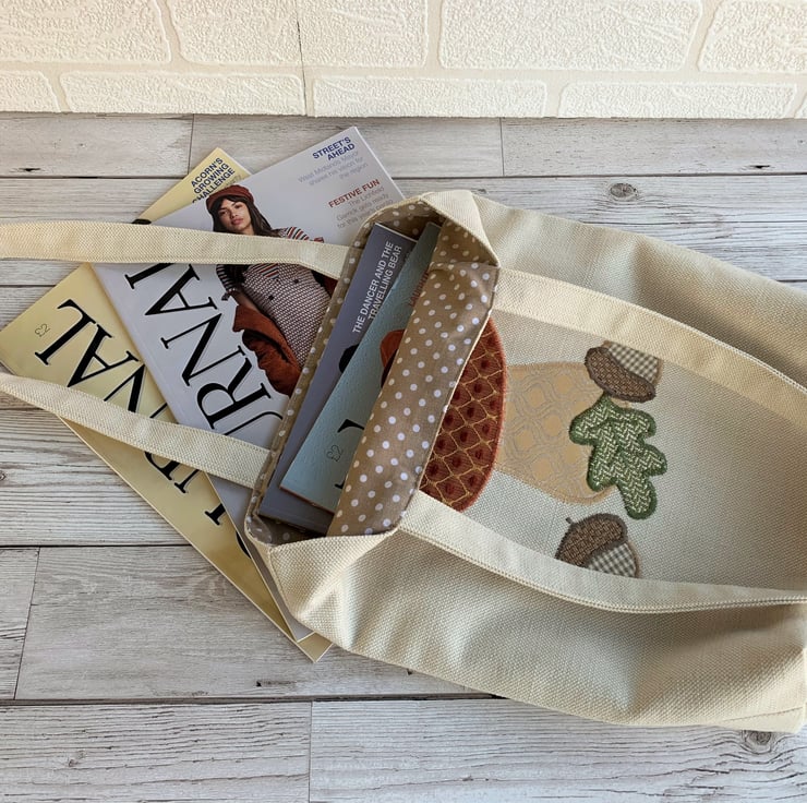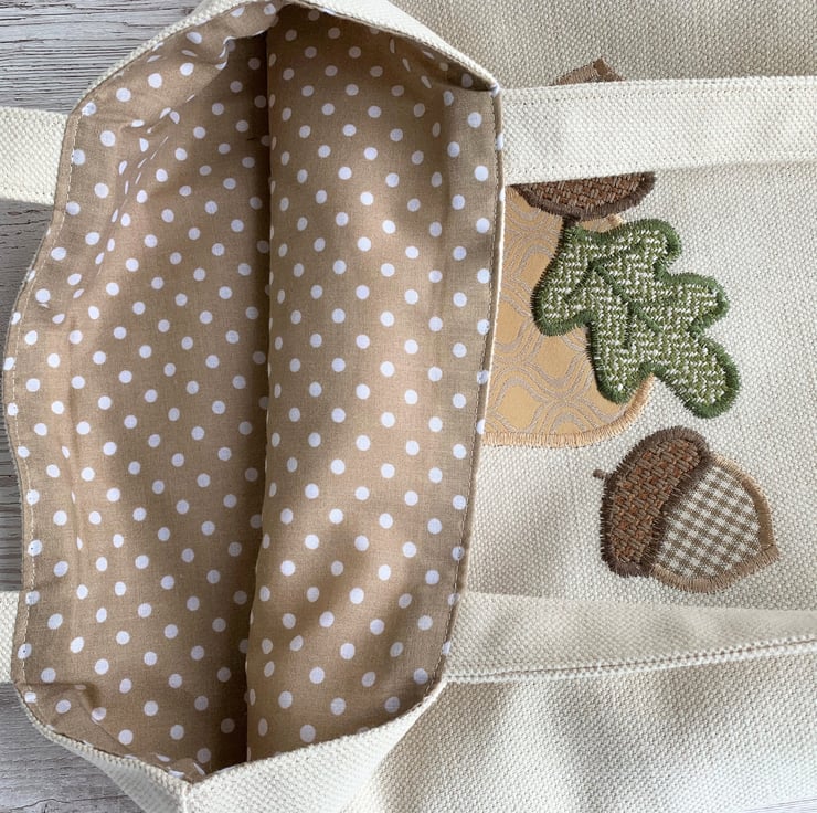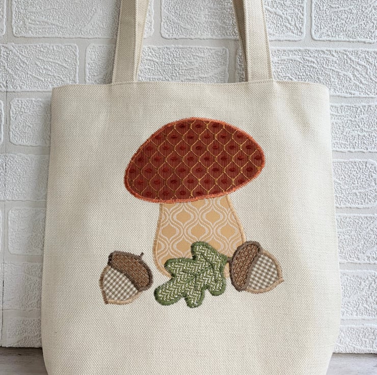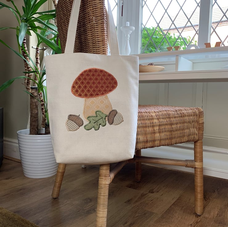 A delightful tote bag in cream fabric with an appliqué Autumn woodland scene featuring a toadstool, acorns and an oak leaf. The top of the toadstool is made from a lovely terracotta fabric with a gold lattice pattern and little velvety textured bobbles in terracotta. The stem is made from a gold and cream fabric which also has a curved lattice-like pattern in the weave. The acorns are made from a cream and beige gingham and a rustic beige fabric. The oak leaf is made from green fabric with a zigzag pattern in the weave. The bag is fully lined with beige fabric with small white polka dots.