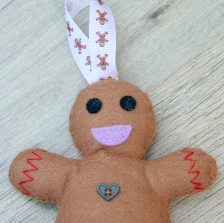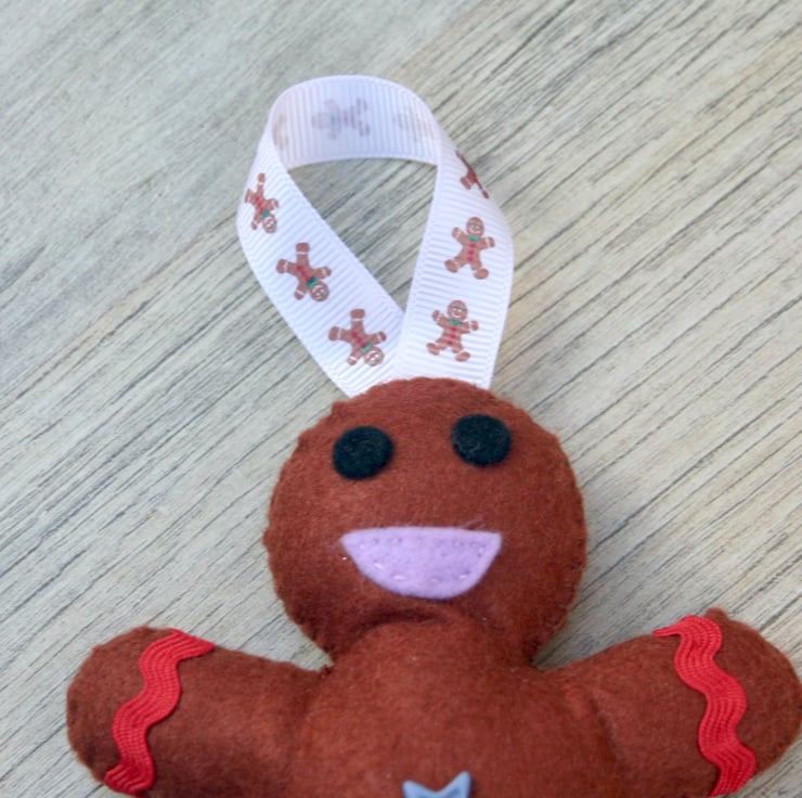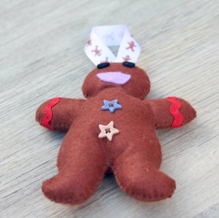 The Gingerbread Man is approximately 15cm tall (not including loop hanger) and made of wool blend felt with star shaped buttons. The loop is made with white ribbon, featuring a Gingerbread Man design and is approximately 6cm.