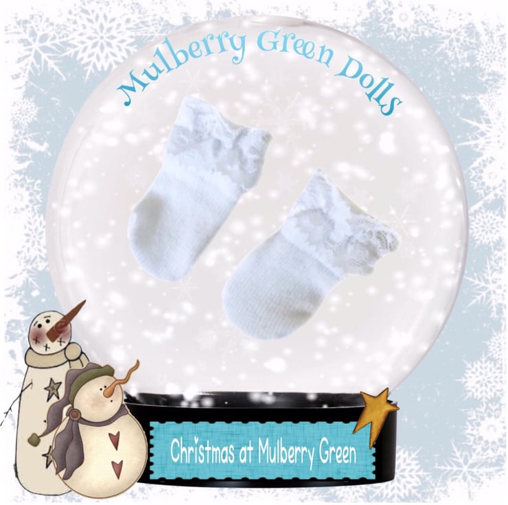 A cute little pair of frilly white ankle socks to fit the Mulberry Green characters. The socks look lovely with the little felt shoes. They can also be put over the linen feet of the older version of my dolls so that shoes can be worn.