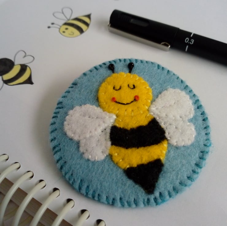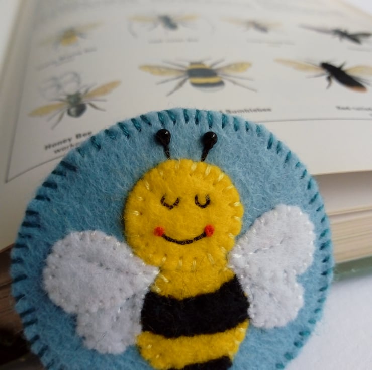 The bee is set against a sky blue, circular, felt background, with hand-stitched detail around the perimeter.