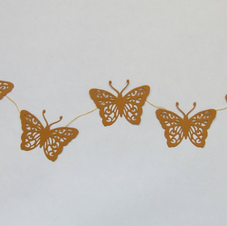 Pretty butterfly bunting made from golden brown card and measuring 152 cm long. There are 7 butterflies each measuring 6 x 8 cm and threaded onto a yellow gold thread with loops at each end for hanging. The butterflies can be moved to the desired position.