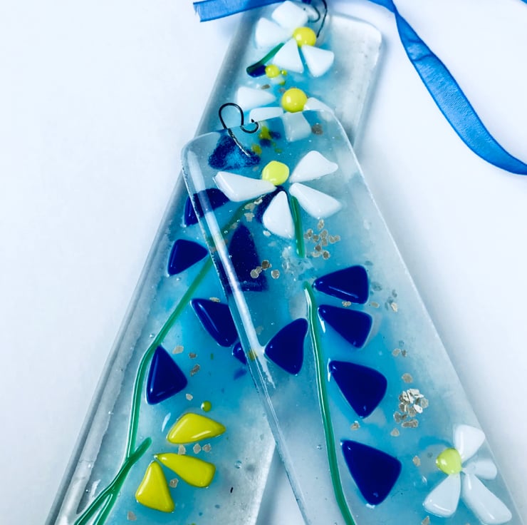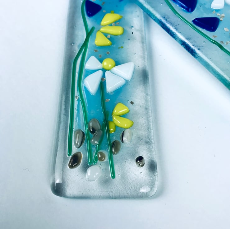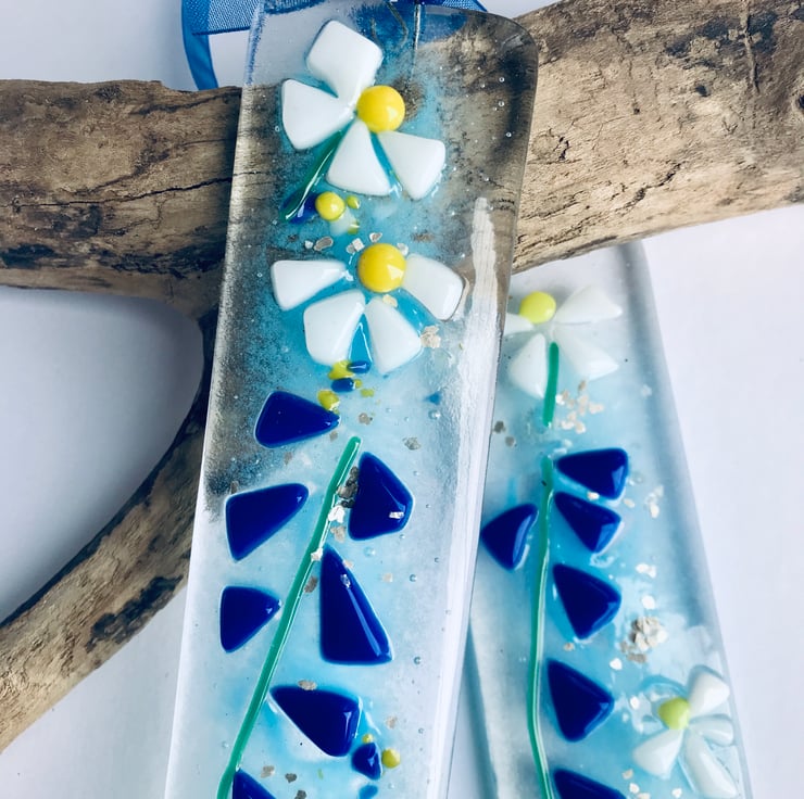 It’s made from two layers of hand cut glass which is fully fused (and I’ve also added some glitter in between the layers). I’ve then cut and added glass to form the flowers and added silver glittery flakes. It measures approx 22cm by 5cm.