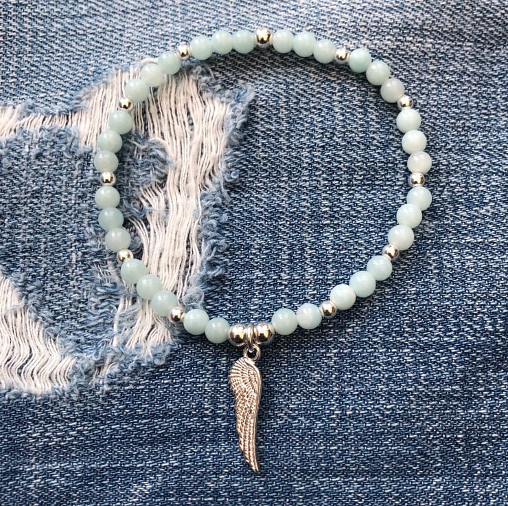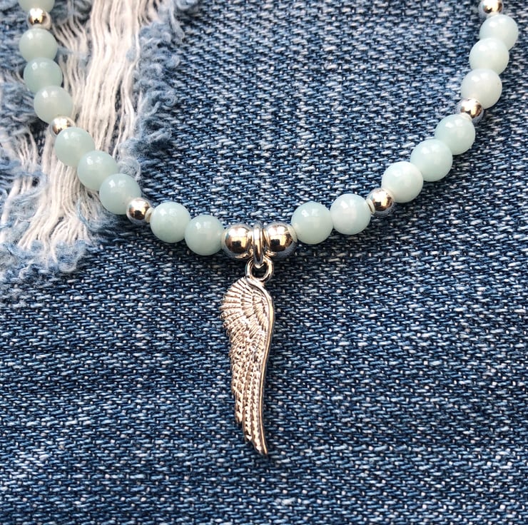 Made using 4mm Chinese amazonite, sterling silver beads and a sterling silver angle wing charm.