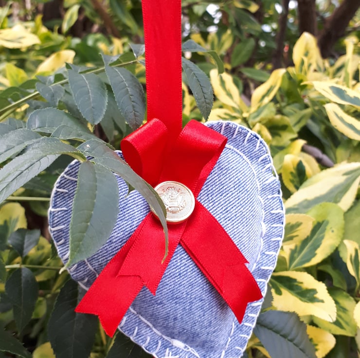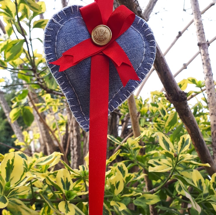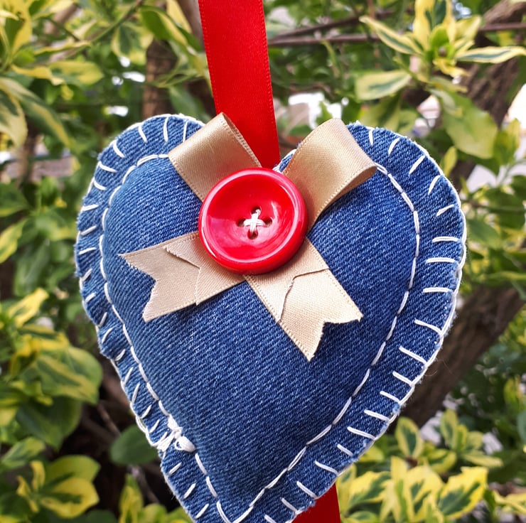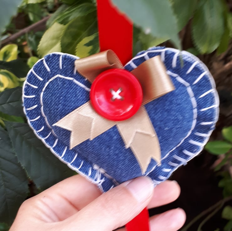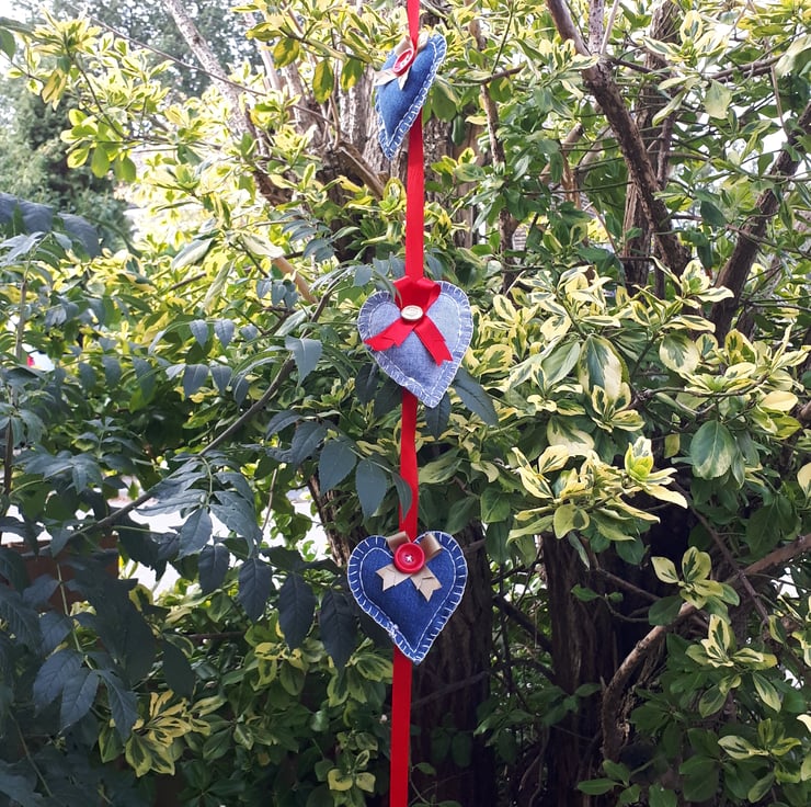 Denim hearts hanging garland. Made using red ribbon, assortment of buttons and upcycled denim.