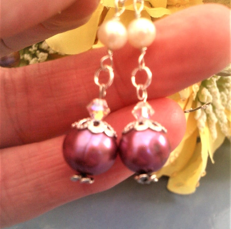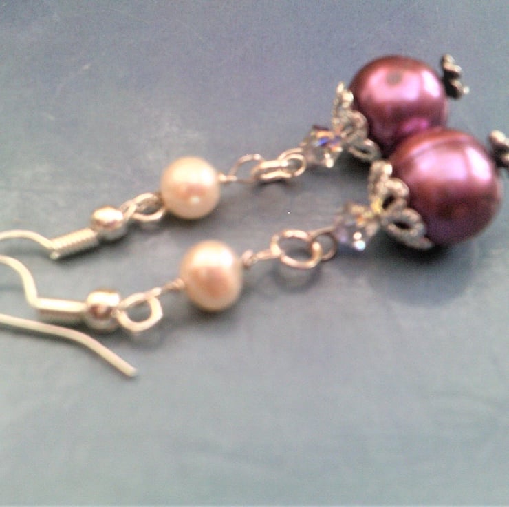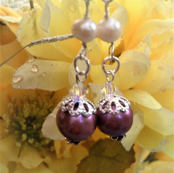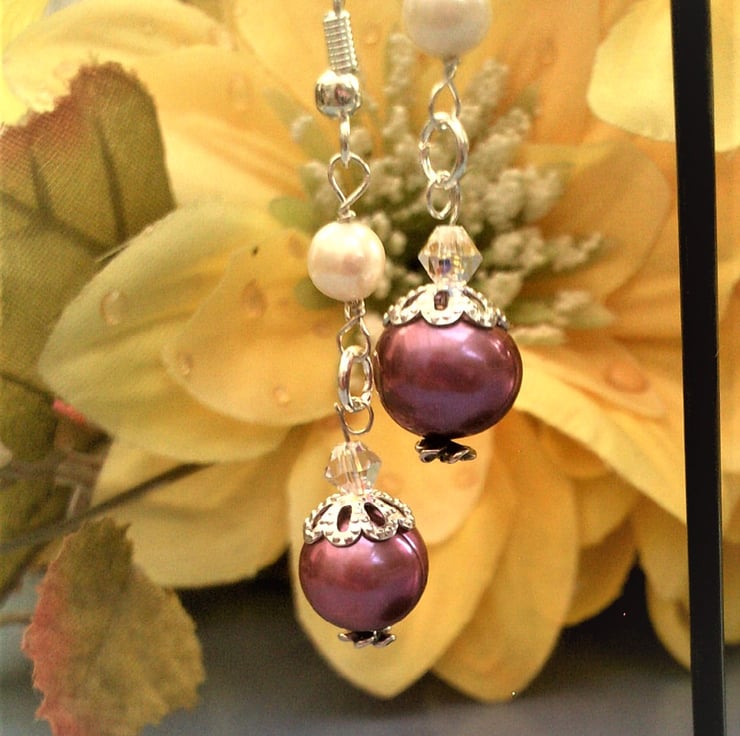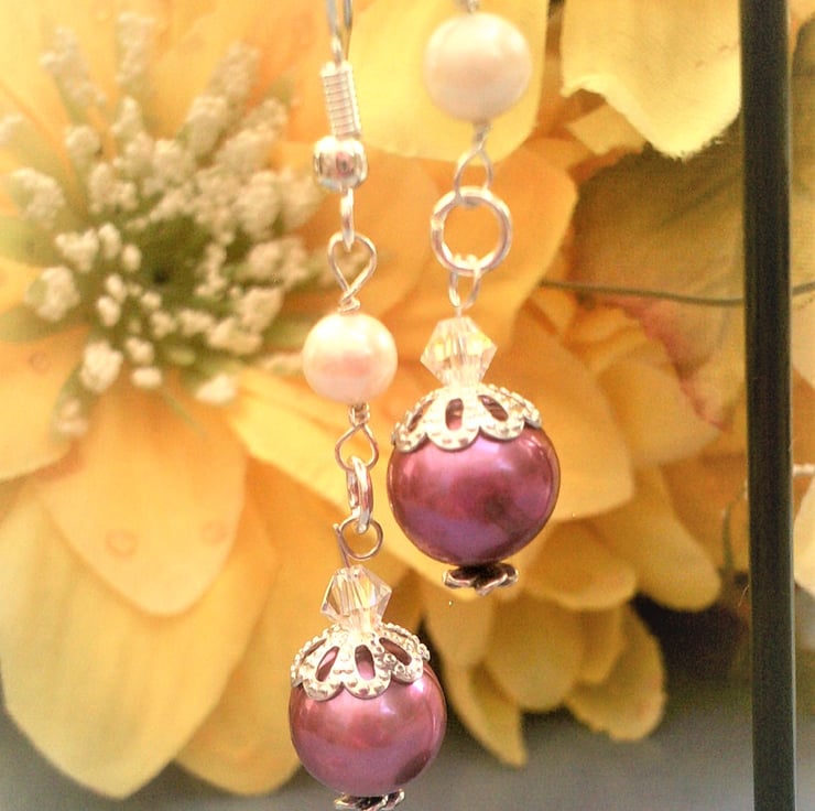 Purple Lilac Mauve Shell pearl earrings with white 7mm freshwater pearls, and Swarovski lavender bicone beads. The headpin is sterling silver with a rose flower head, and the ear hooks are silver plated, OR you can choose sterling silver from the drop down menu. The drop of these lovely earrings is 4.5cm.