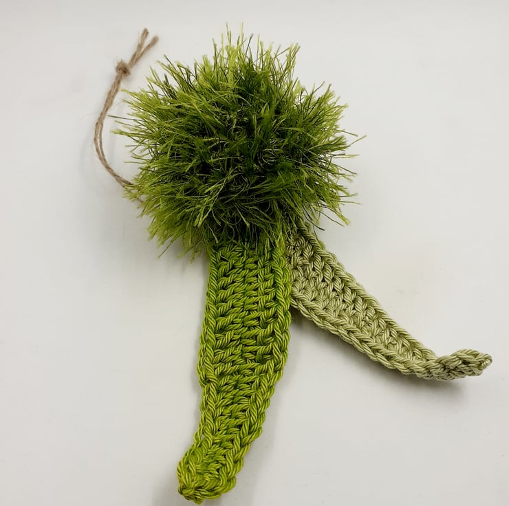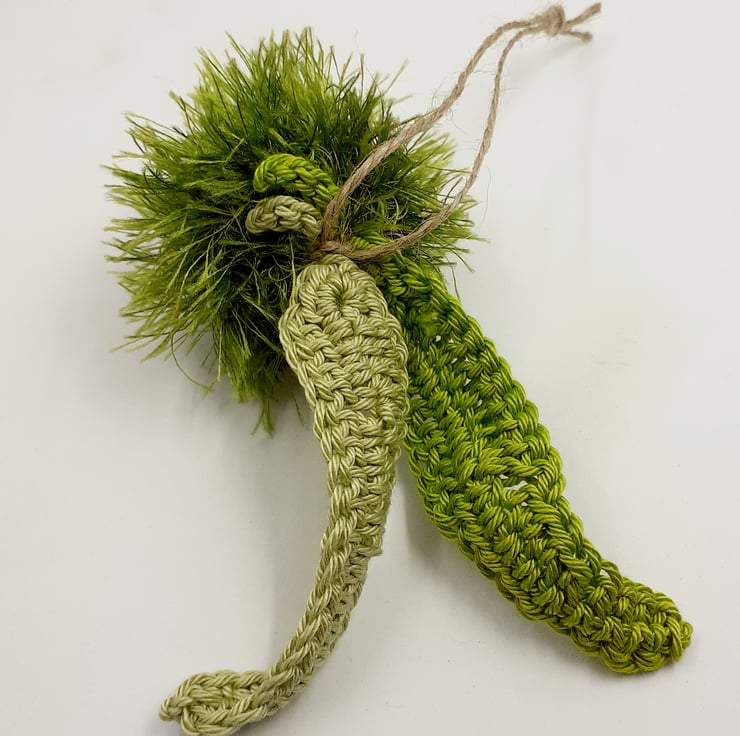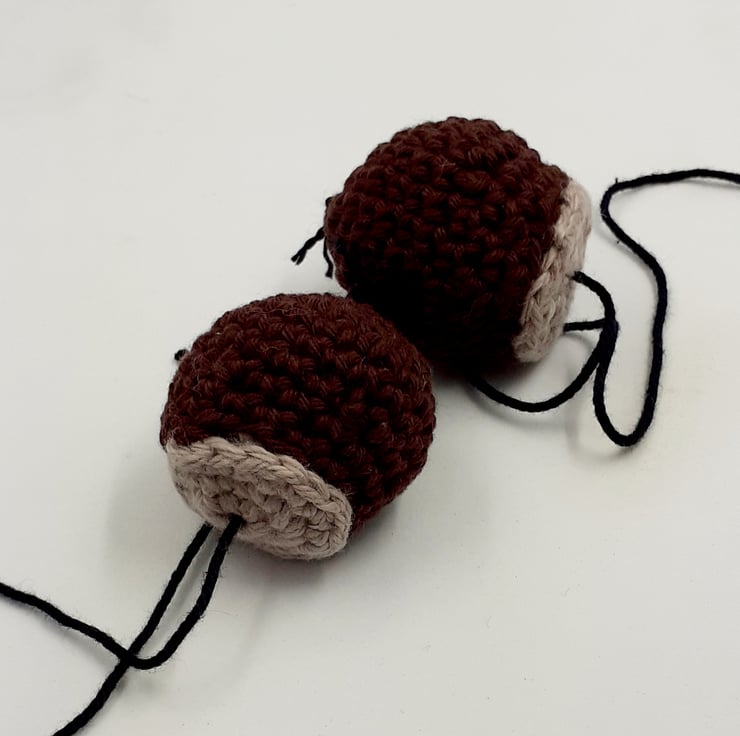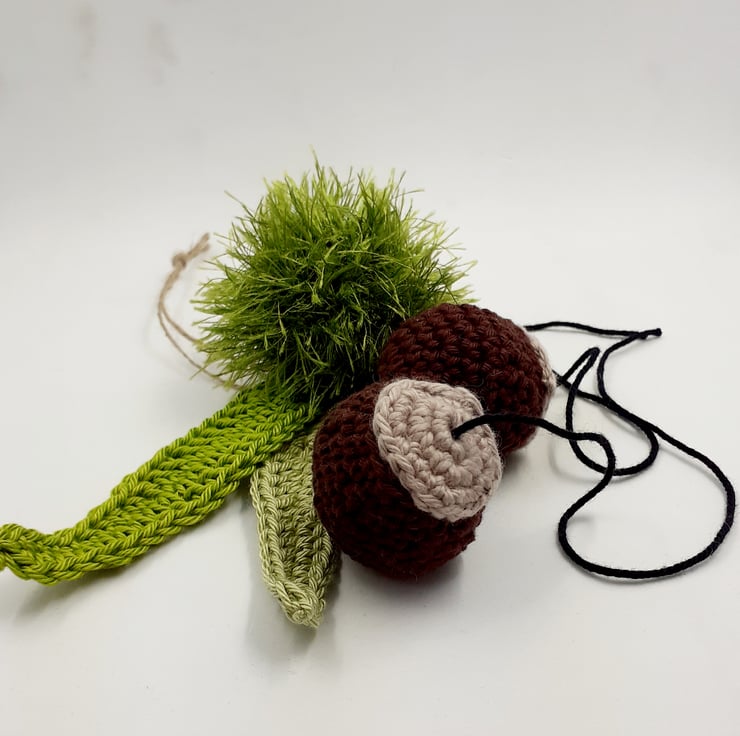 These autumnal decorations are crocheted in cotton and eyelash yarn. The conkers and chestnuts are filled with polyester stuffing. The sweet chestnuts have a jute hanging loop which is easily removed if not required.