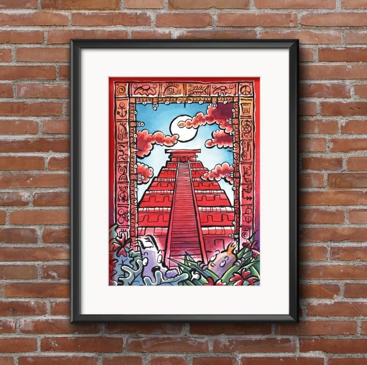 I love Mayan imagery and the Temple at Chichen Itza, so this was a joy to draw. I also wanted to do something dramatic, but still fun. It’s an image that Tintin fans can relate to, but also a homage to Mayan art. Can you spot the Tintin references in the border?