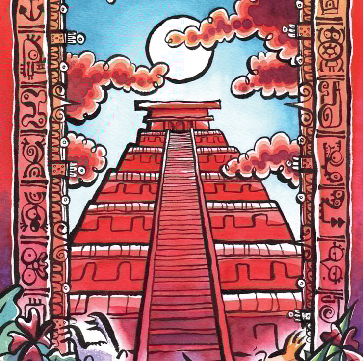 I love Mayan imagery and the Temple at Chichen Itza, so this was a joy to draw. I also wanted to do something dramatic, but still fun. It’s an image that Tintin fans can relate to, but also a homage to Mayan art. Can you spot the Tintin references in the border?