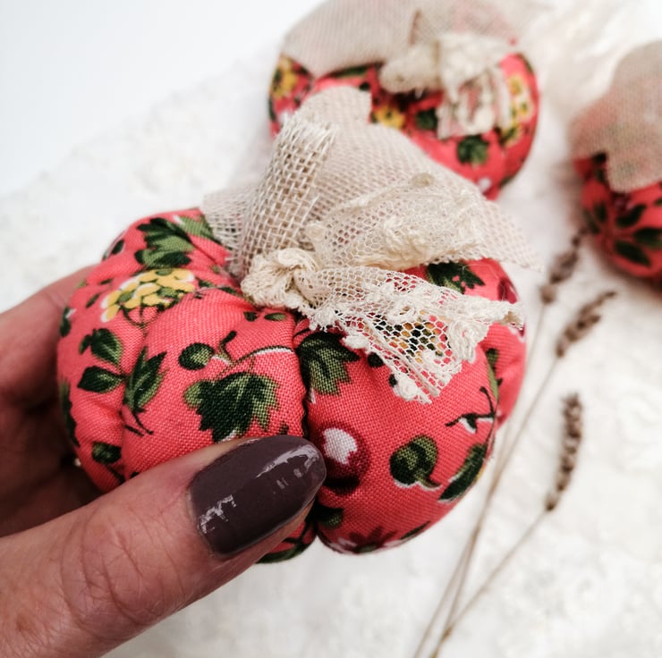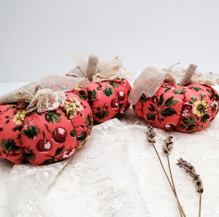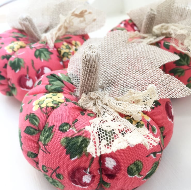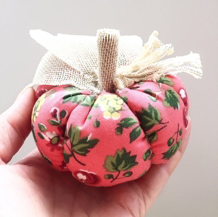 Cute handmade pumpkin, in Liberty of London, Wild Cherry, perfect to adorn any Mantel, shelf or table, to add a touch of Autumn to your Home Decor.
