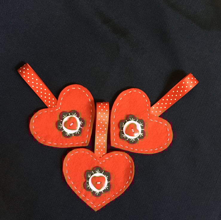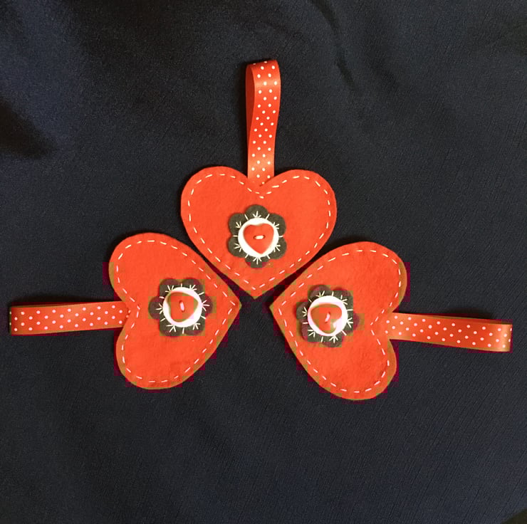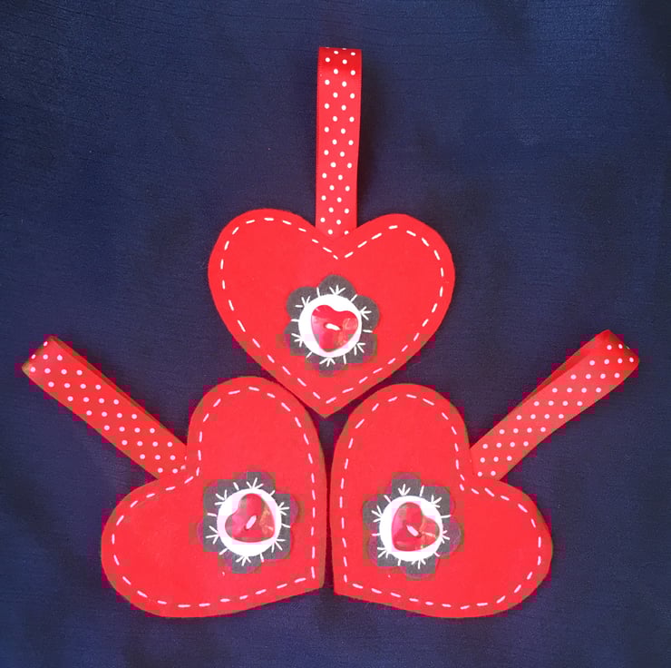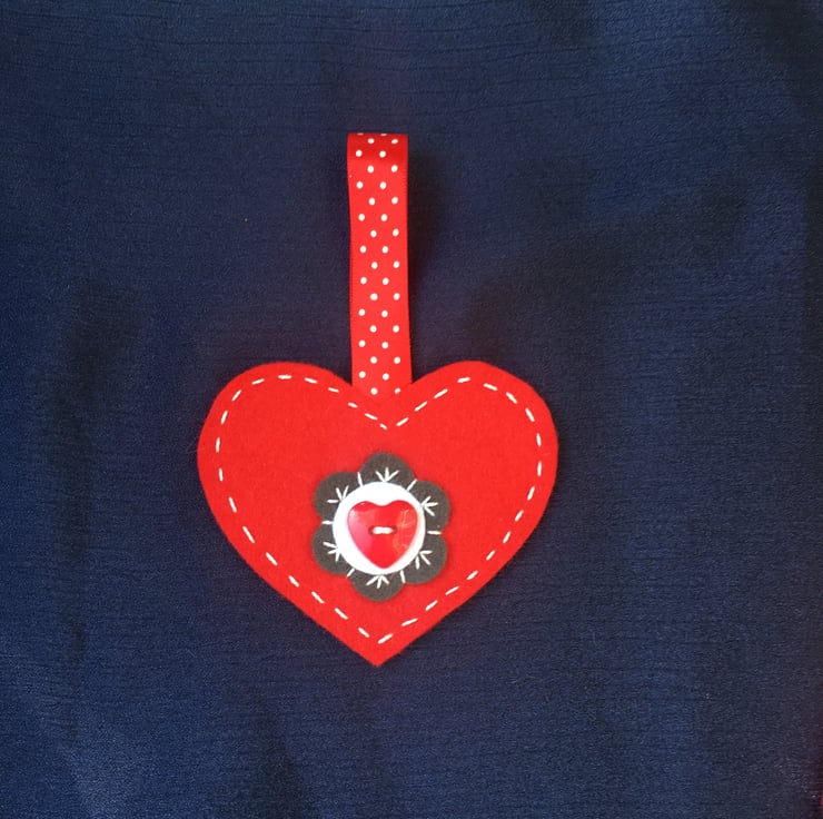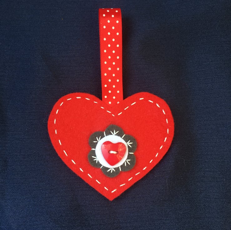 The heart is made from red, grey and white felt, a decorative button, and is hand embroidered. It is finished with complimentary ribbon.