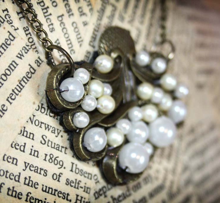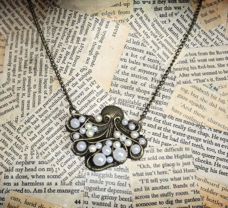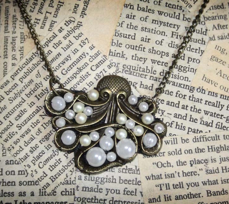 A variety of faux pearl beads have been hand sewn between the tentacles of an antique gold tone octopus pendant to create a beautiful tactile necklace.
