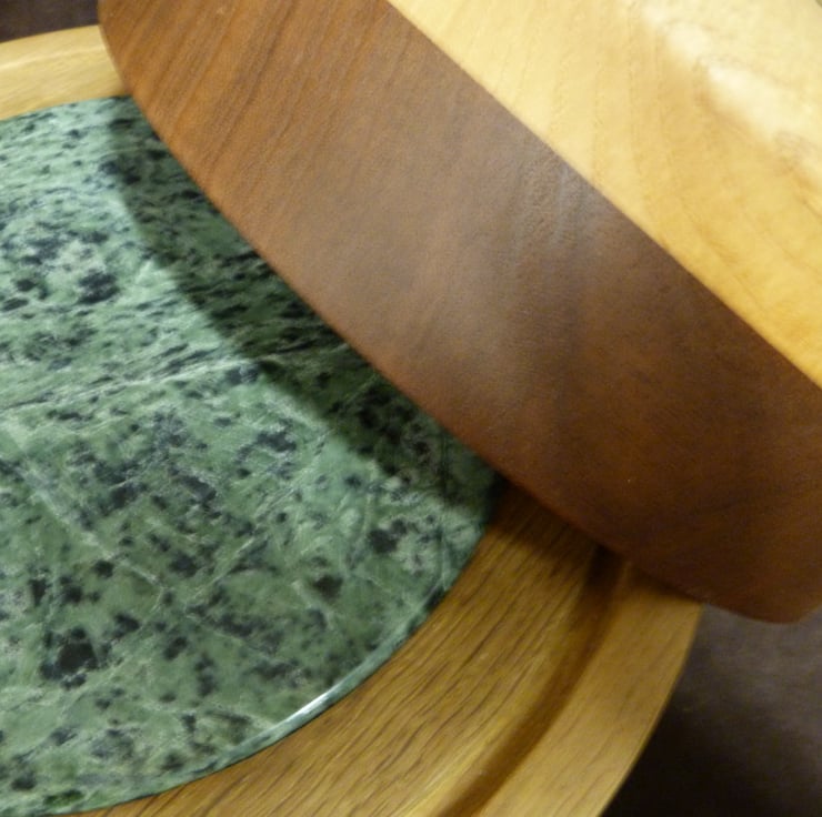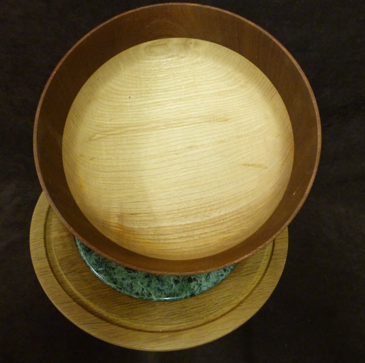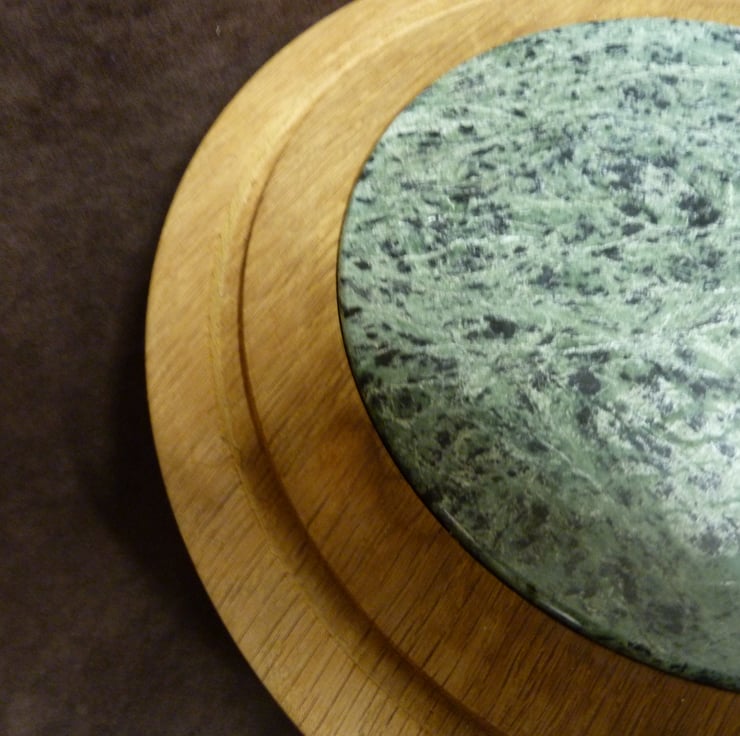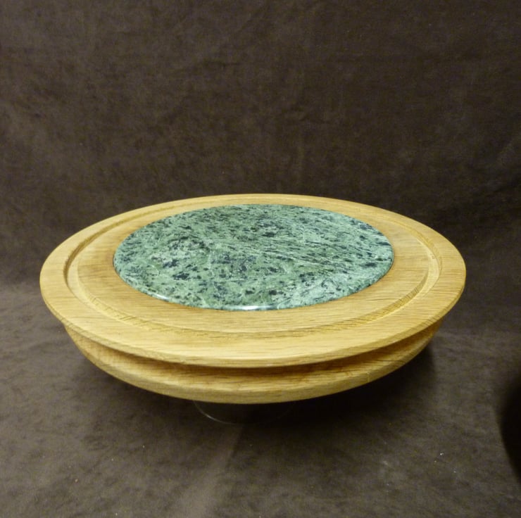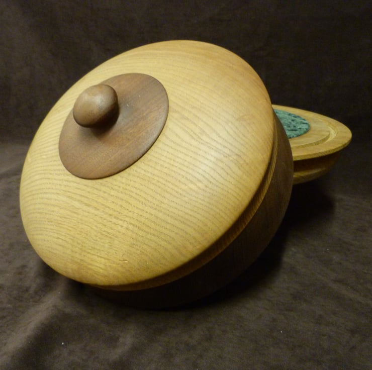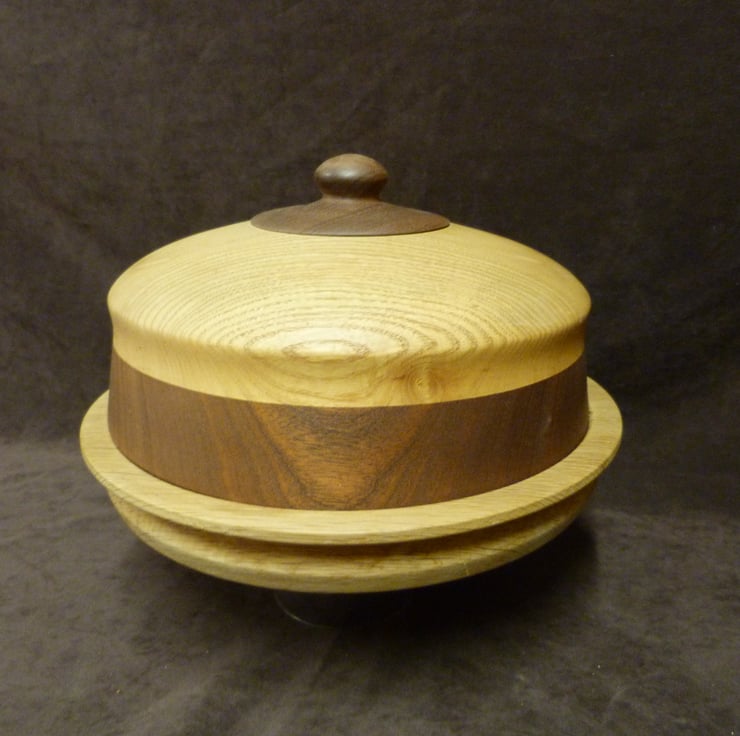 A COVERED CHEESE BOARD, IN ASH AND MAHOGANY, THE BASE BOARD IS IN OAK, WITHE A 200 MM ROUND GREEN TILE SET IN, THE FINISHED ITEM IS 290MM IN DIAMETER AND 180MM IN HEIGHT, THREE COATS OF FOOD SAFE, READY FOR USE.