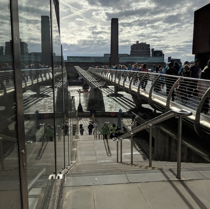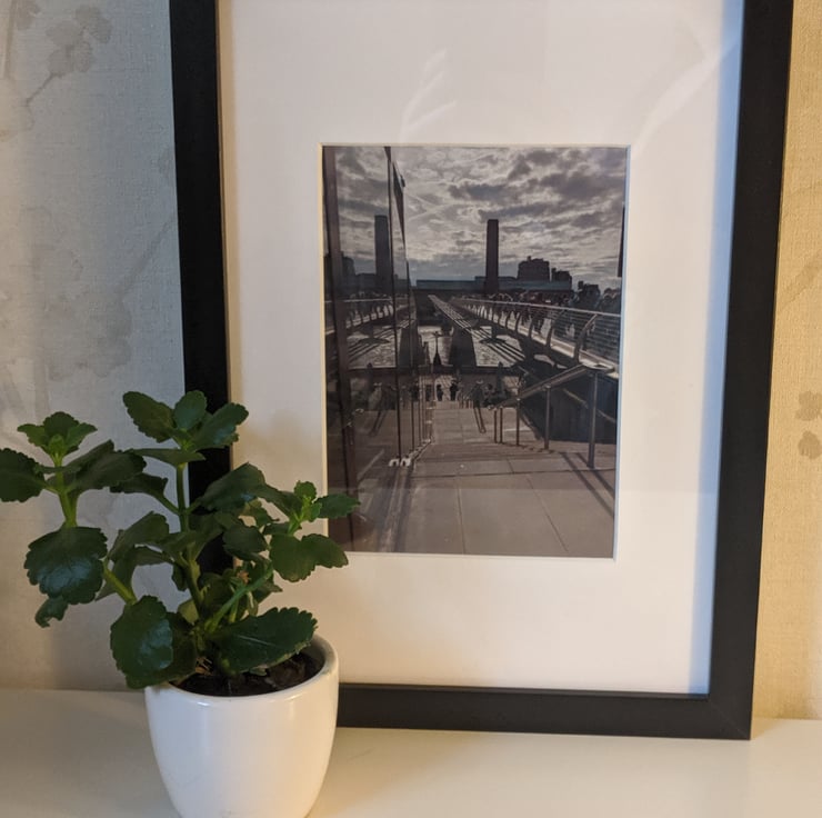 Atmospheric print of a London street scene featuring the Tate Modern and Millennium Bridge, reflected in the glass of a building. Perfect housewarming gift!