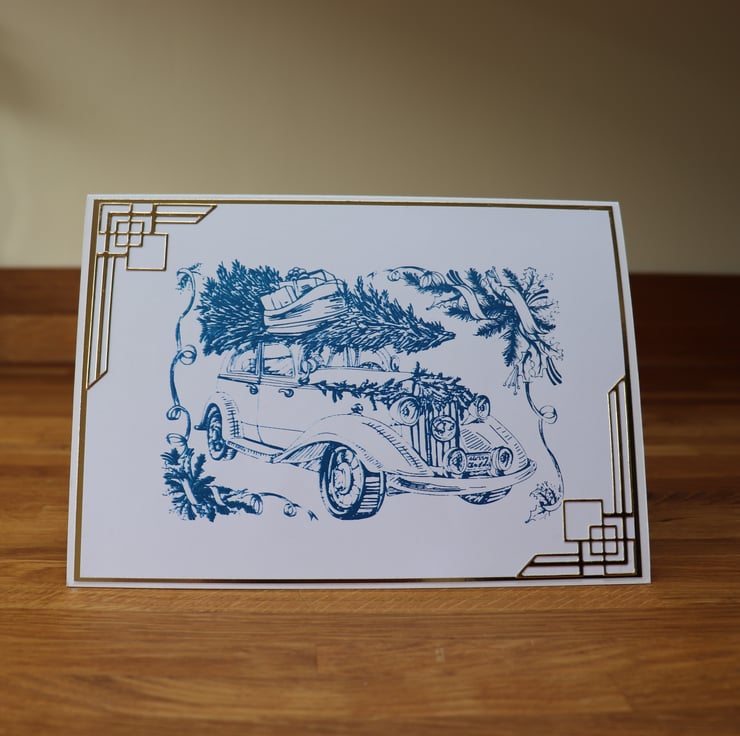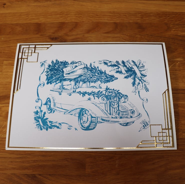 The front of the card has that Art Deco feel to it, as I have screen printed the Christmas tree on top of a vintage car and used Art Deco corners to finish it off.