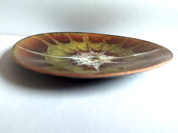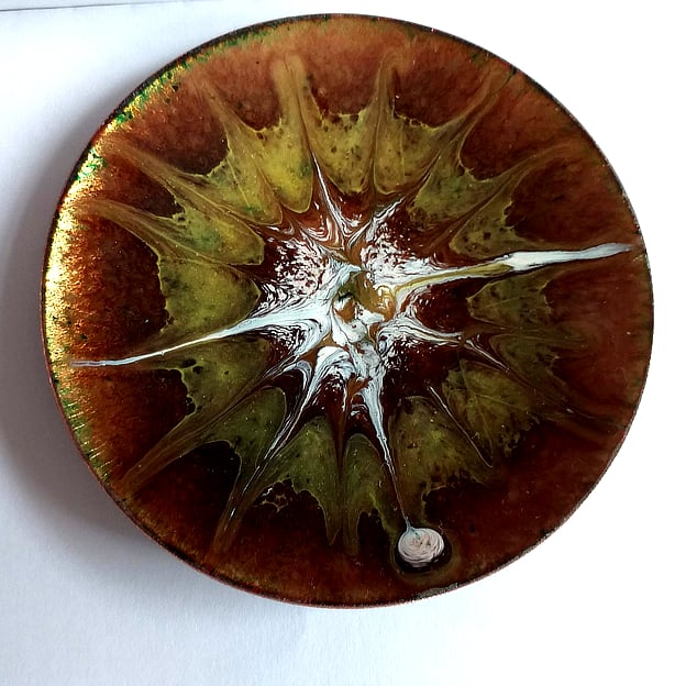 Setting out with the idea of making an autumn themed dish I built up a base of clear enamel on the copper then added a coat of chestnut brown.Over that I scattered a ring of yellow enamel an, in the centre, a pile of white. When the dish was at red hot, in the kiln, I disturbed the surface of the enamel with a steel point to make the unique, random patterning that decorates it. Depending on the way in which light strikes the dish the copper beneath the enamel shimmers and sparkles golden brown and modifies the tones of the brown and yellow.