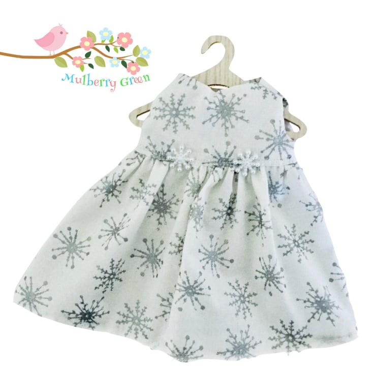A beautiful little dress made from best quality cotton in a silver print. The dress has a lined bodice and a gathered skirt and comes on a cute little wooden hanger. It is trimmed at the waist with little pearl decorations.