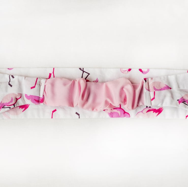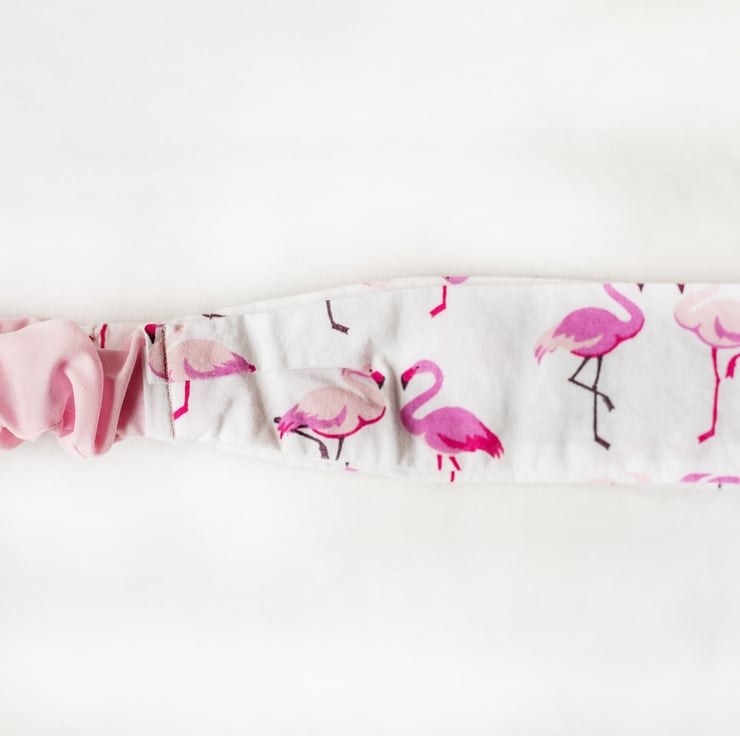 Fun 100% cotton headband with a tropical flamingo print on a white background.