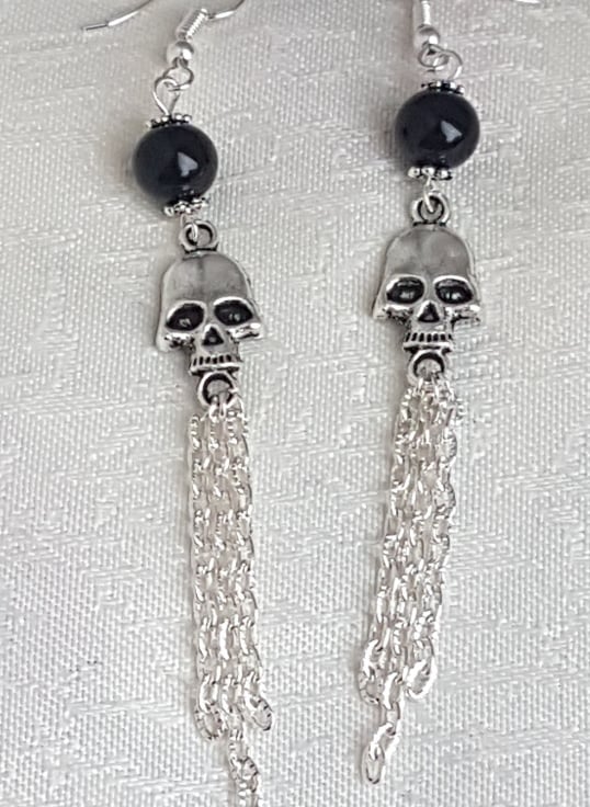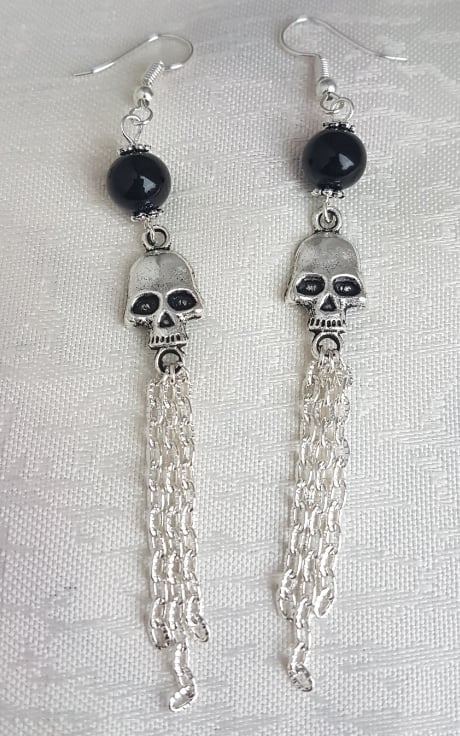 Earrings made up of Black glass pearls, Skulls charms and dangly silver plated chain.