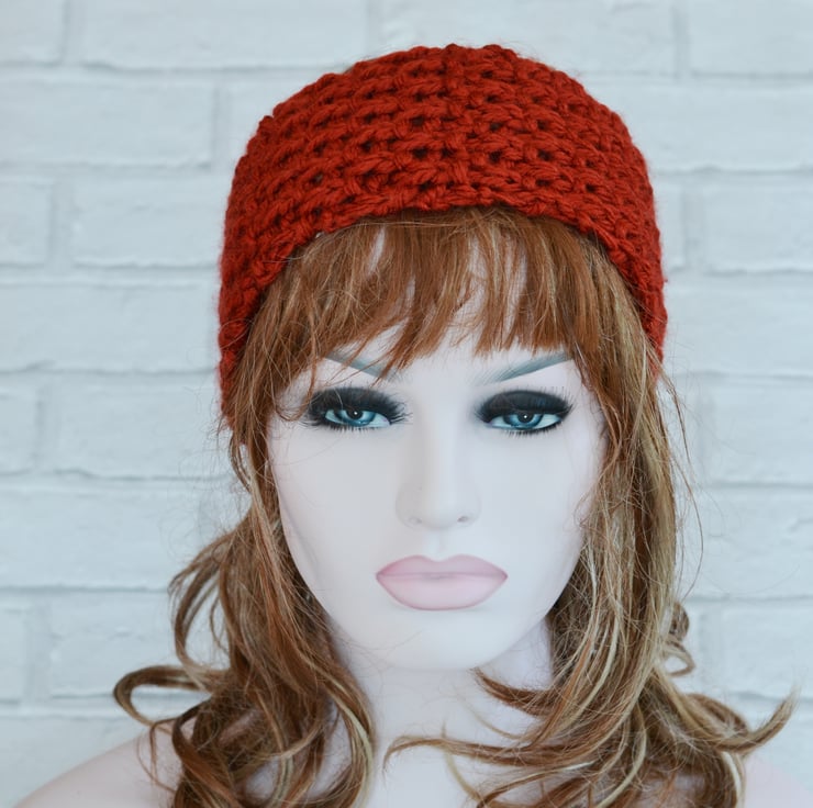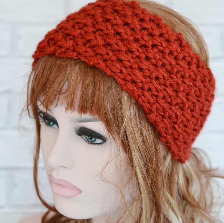 Knitted in a chunky yarn in a lovely shade of russet, rust