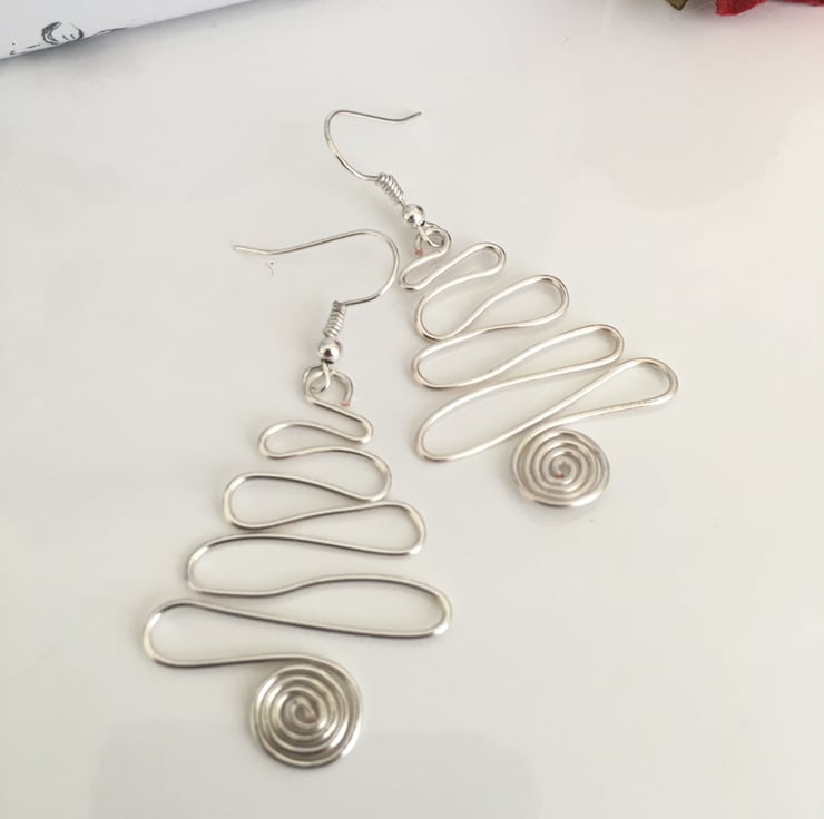 Shaped into a christmas tree wth a spiral coil at the end, each earrings has been hand formed, and slightly hammered to harden the metal.