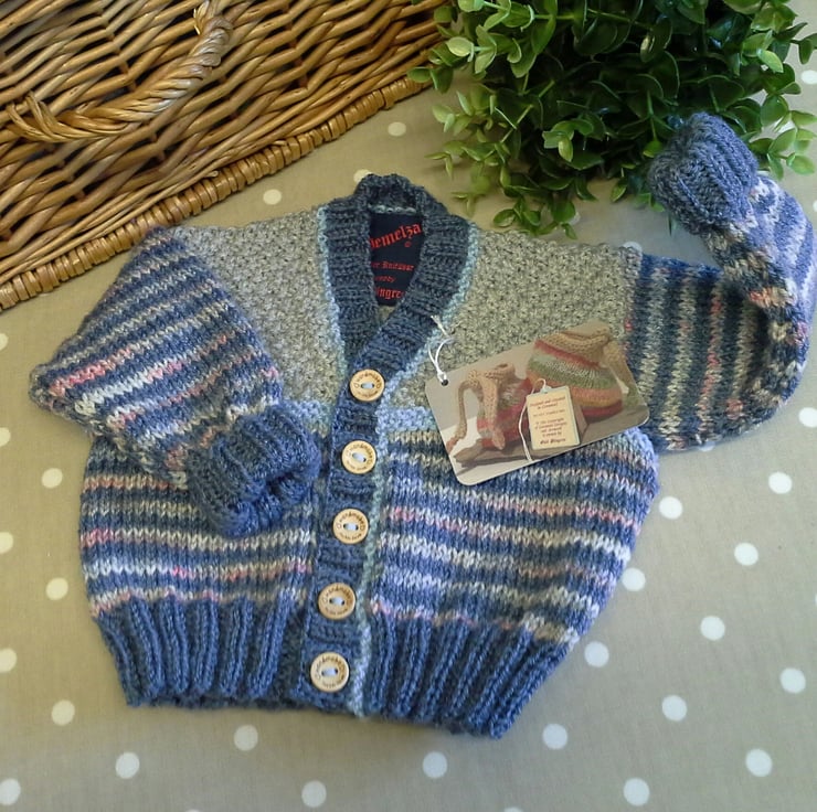 A very unique eye catching baby boys cardigan designed and hand crafted using quality branded British and French machine washable yarns.