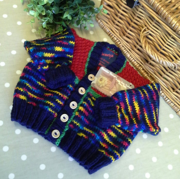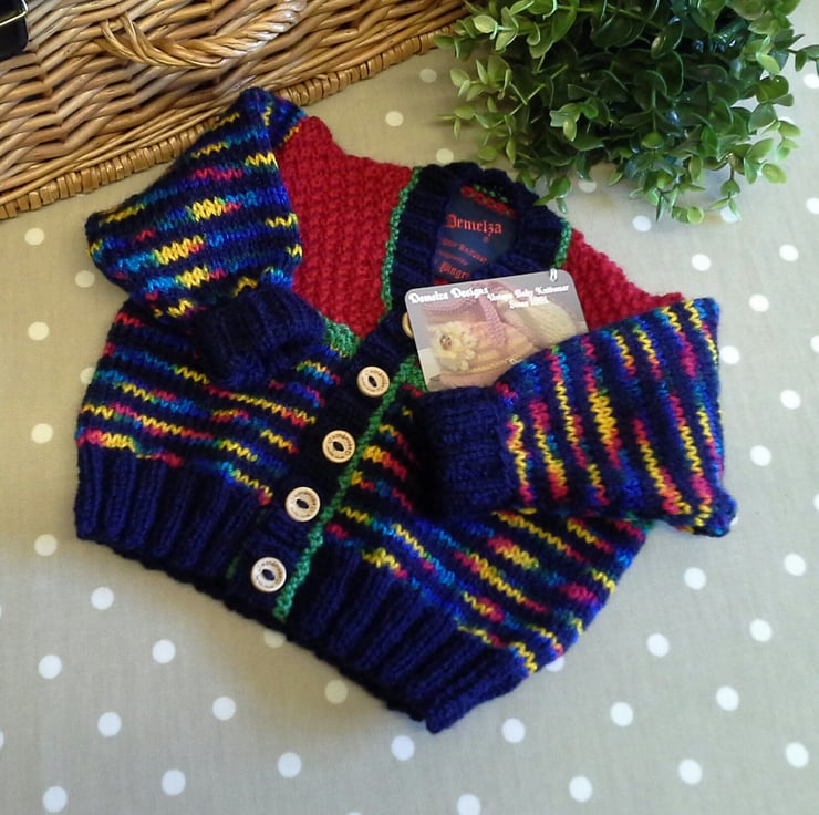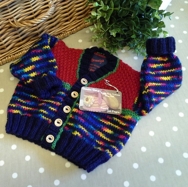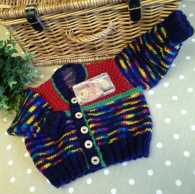 A very unique eye catching cardigan suitable for either sex baby designed and totally hand crafted using quality branded British machine washable yarns.