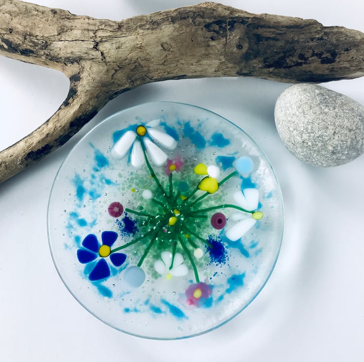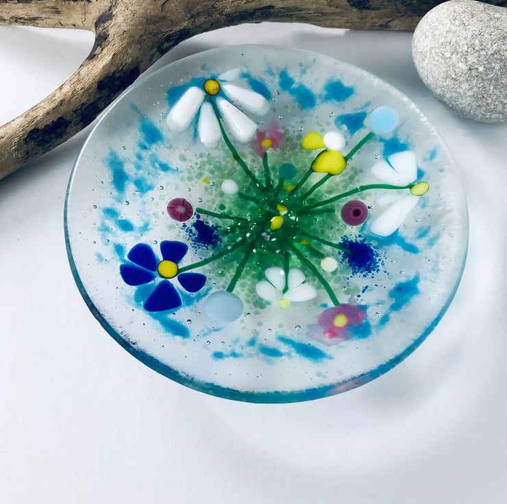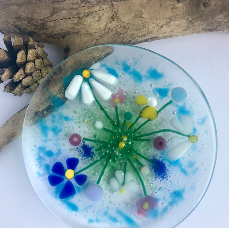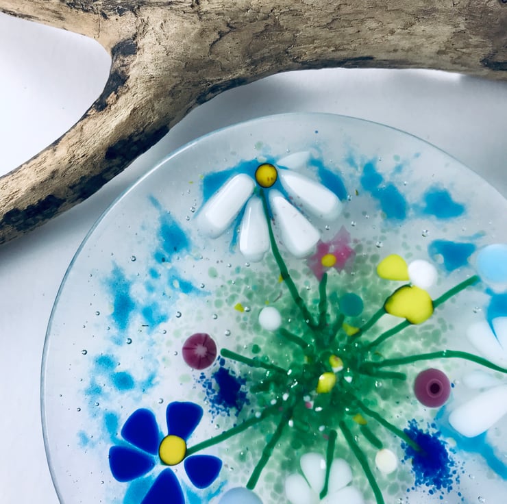 I made this dish by firstly cutting two matching circles followed by the shapes used for the flowers. It was assembled then fully fused in a kiln. I then added a daisy which I tack fused onto the dish and unlike the other flowers this one stands out slightly from the rest of the dish. Next step was to cold work the glass circle to ensure there was no sharp edges before finally being placed in a mould to be slumped into shape. All in all the dish was in the kiln over 20 hours.