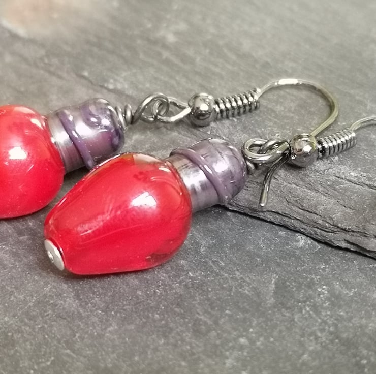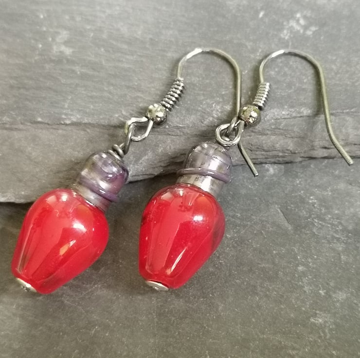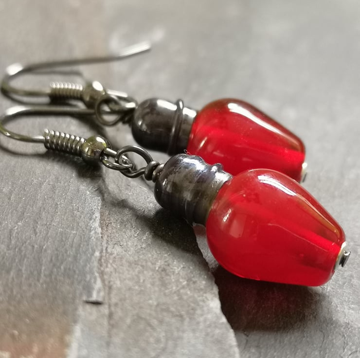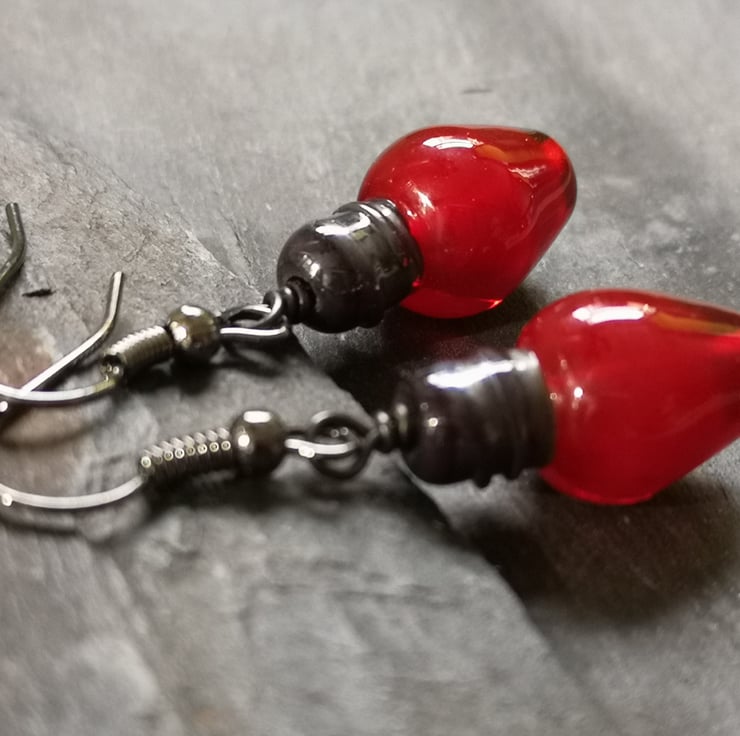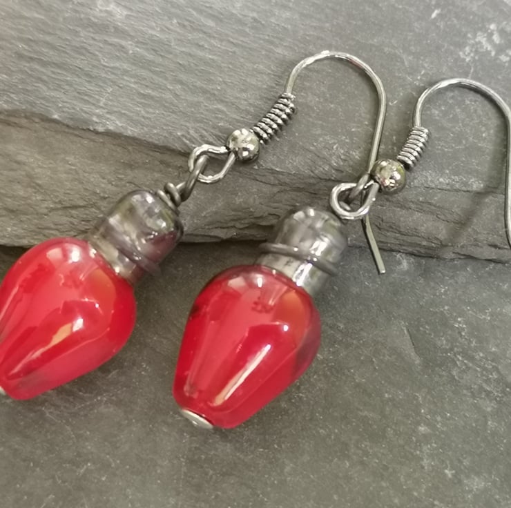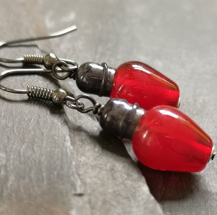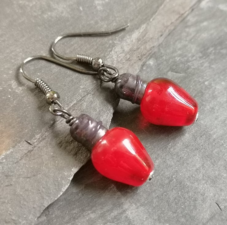 These cute little earrings have been made with handmade red lamp work glass beads in the shape of a fairy light bulb. They've been attached to gunmetal grey ear wires.