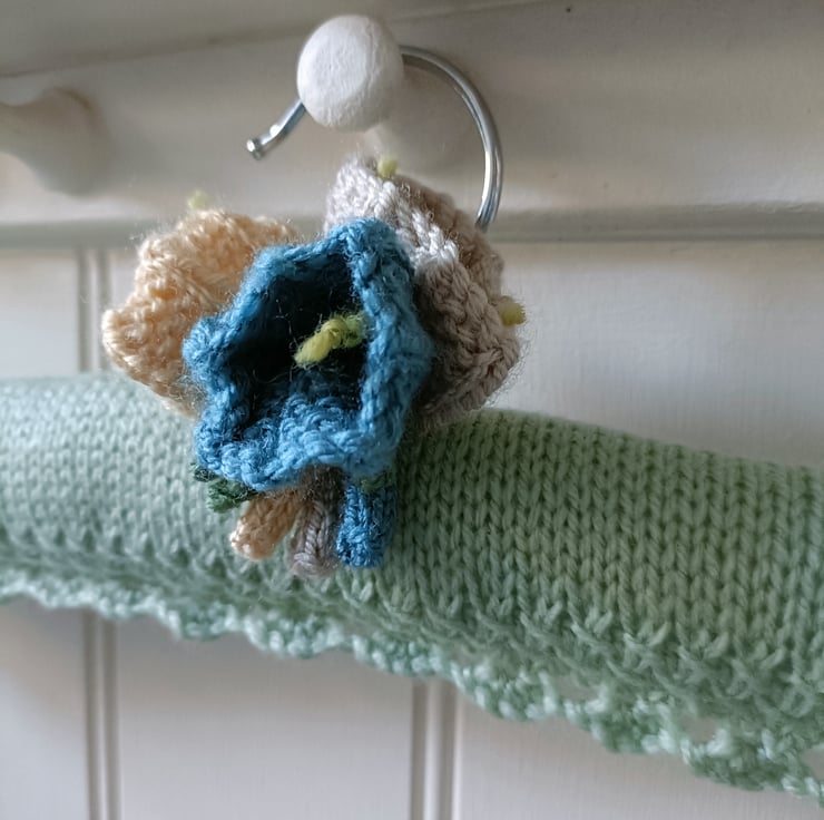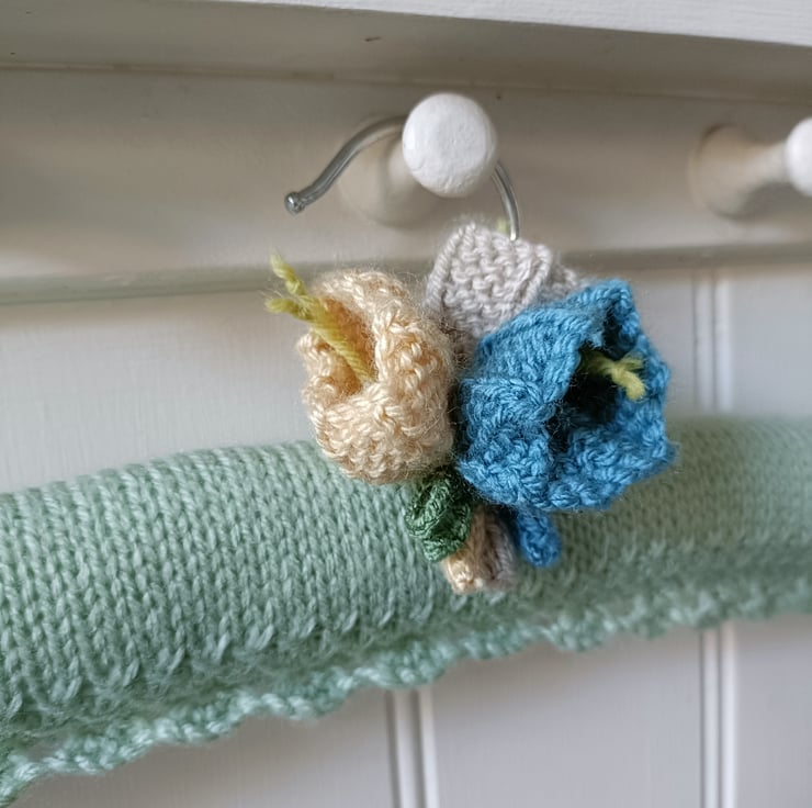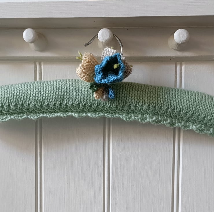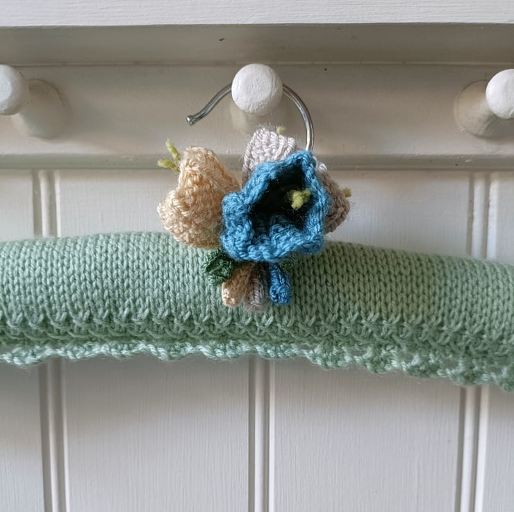 A beautifully hand knitted ladies coat hanger with a little bouquet of crocus flowers. The hand knitted cover uses a pale green coloured yarn knitted in smooth stocking stitch with lace stitch detail on the front and back and a delicate knitted picot edging. The crocus are knitted in primrose yellow, Nordic blue and oatmeal coloured yarns, with lime green stamens. They are attached securely just under the metal hook with a darker green hand made cord tied in a bow. The wooden hanger is generously wrapped in wadding to give a good soft padding. A perfect addition to any wardrobe and bedroom decor.