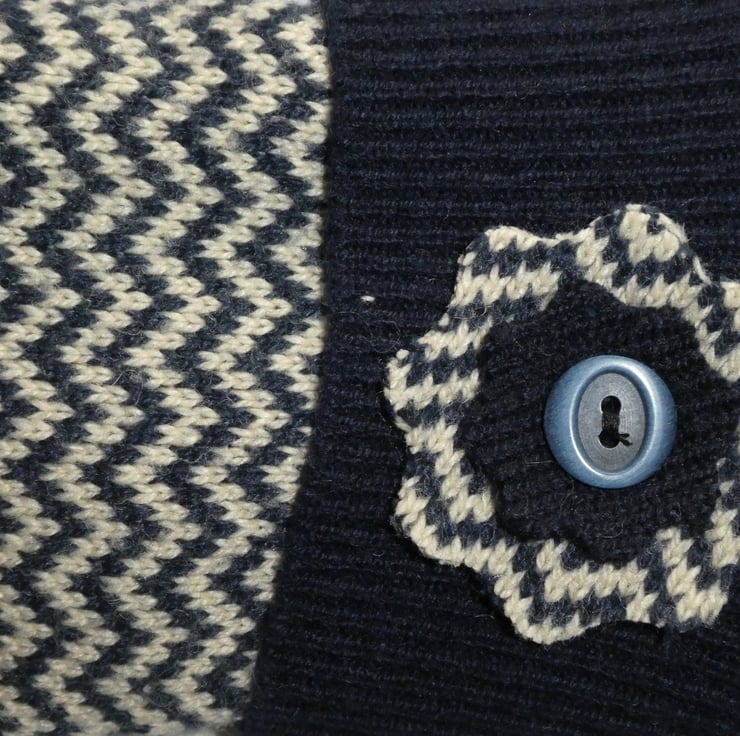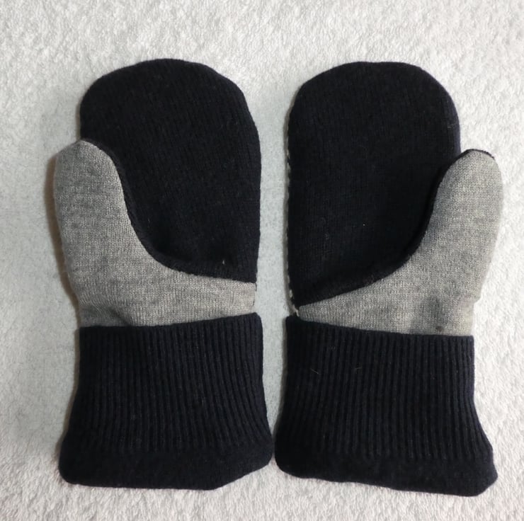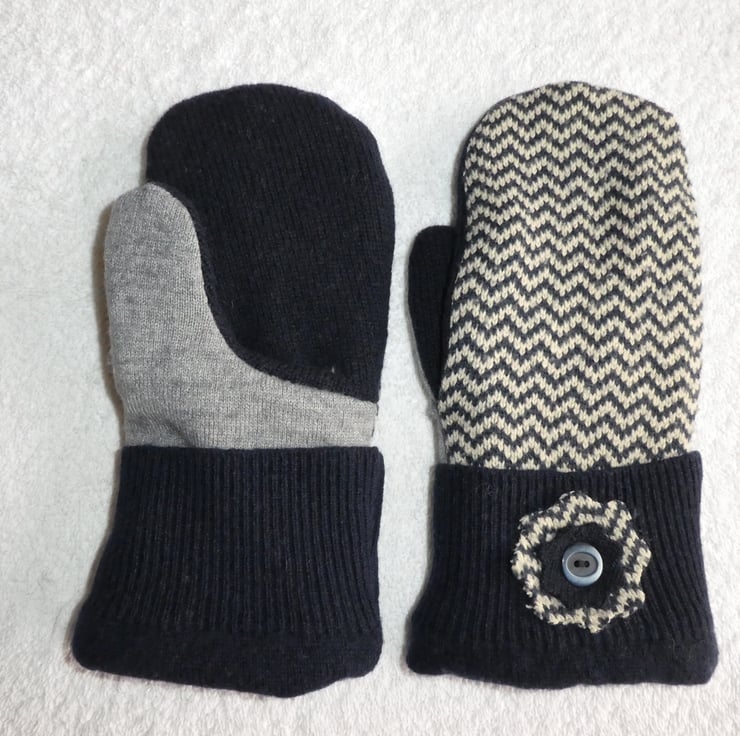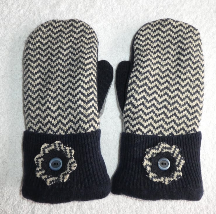 These warm and cosy winter mittens have been re-fashioned from up-cycled 100% wool sweaters. The jumpers have been washed and felted before cutting and stitching. A full lining for the mittens has been made from polyester polar fleece for warmth and comfort. A decorative felt flower with button center has been stitched to the cuff of the mittens.
