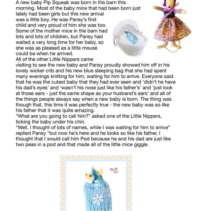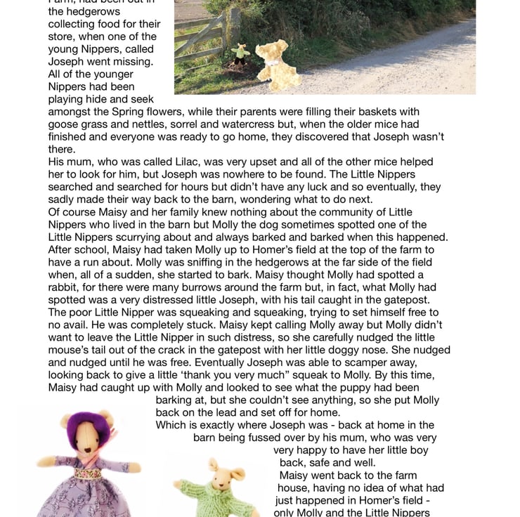 Little Nippers are a community of little mice, who live in the barn at Mulberry Farm. They are sometimes very hard to spot - but they are always there. Don't forget, next time you are out, keep your eyes open and you may just see a Little Nipper scurrying about.